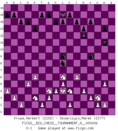 Last move : 0-1 2021 April 12 0:22:51 [Event "FICGS__BIG_CHESS__TOURNAMENT_A__000006"] [Site "FICGS"] [Date "2021.02.11"] [Round "1"] [White "Kruse,Herbert"] [Black "Skwarczylo,Marek"] [Result "0-1"] [WhiteElo "2102"] [BlackElo "2177"] 1.j2-k4 p16-o14 2.h1-o7 h15-g13 3.m2-m4 j15-k13 4.l1-p5 k16-h15 5.e2-e4 h16-n11 6.d2-d4 n11-p11 7.p5-o4 b16-c14 8.h2-g4 g16-j15 9.b1-c3 e15-e13 10.c1-o12 p11-b11 11.f1-b5 m15-m13 12.n2-n3 l16-p12 13.k1-h2 n15-n14 14.o1-f9 o16-m14 15.f9-e8 b11-o11 16.o7-o11 p12-o11 17.o12-k8 f16-b12 18.g1-j2 d15-d14 19.p1-o3 m14-n13 20.k8-j9 n13-j9 21.o4-j9 o11-l8 22.m1-m3 c16-h11 23.e8-h11 l8-h11 24.a2-a4 o14-n12 25.j9-p15 q16-p16 26.p15-j9 p16-p9 27.j9-p3 k13-l11 28.m3-l3 j15-k13 29.l3-l5 m16-p16 30.l5-q5 p16-p15 31.q1-m1 h11-k9 32.e1-e3 j16-j15 33.e3-f3 e16-p16 34.f3-f7 n12-m10 35.a1-e1 m10-n8 36.q5-q12 p15-p12 37.q12-p12 p16-p12 38.m1-m3 n8-o6 39.f7-o7 o6-n4 40.o7-o15 n4-p3 41.q2-p3 k9-o13 42.b5-d3 j15-k14 43.e4-e5 l11-n12 44.m3-l3 a16-n16 45.e5-e6 l15-l14 46.d3-n12 p12-n12 47.e1-e5 p9-q9 48.l3-l5 h15-k16 49.e5-k5 k14-j15 50.l5-q5 n12-q12 51.q5-q9 q12-q9 52.k4-j6 k13-m14 53.o15-p15 o13-p14 54.k5-p5 q9-q14 55.p5-k5 b12-e9 56.g4-e3 e9-k14 57.k5-b5 c14-d16 58.b5-c5 c15-c14 59.j2-k4 m14-o13 60.p15-p14 q15-p14 61.j1-j2 k16-m15 62.c5-p5 k14-n11 63.h2-g4 p14-p13 64.p5-p8 q14-q8 65.p8-q8 n11-q8 66.c3-e4 n16-q16 67.b2-b3 d16-e14 68.l2-l4 e14-f12 69.l4-l5 m15-l13 70.d4-d5 l13-k11 71.k4-m3 o13-m12 72.e4-g5 g13-h11 73.j6-k4 m12-l10 74.g5-j6 f12-g10 75.h3-h4 k11-l9 76.p3-p4 h11-g9 77.p4-p5 q8-m12 78.j2-h3 q16-q11 79.j3-j4 g9-j8 80.j4-j5 g10-j9 81.g2-g3 q11-p11 82.m3-n5 l10-n9 83.h3-j4 l9-m7 84.n5-m7 n9-m7 85.l5-l6 m7-n9 0-1 Follow this game move after move (download)A great player and a great example for many. His book My 60 Memorable Games had a big impact on me. It is a shame he didn't continue to enrich the world of chess with his unparalleled understanding after 1972. (Jan Timman, about Bobby Fischer's death) Ja, ich habe einmal eine Blitzpartie gespielt, es war in einem Zug, 1929. --im Interview 1989 (Mikhail Moiseyevich Botvinik) Si tu oponente te ofrece un empate, trata de averiguar porque piensa él que esta en una posición peor. (Nigel Short) J'ai toujours senti une vague pitié pour l'homme qui ne connaît rien aux échecs, tout comme j'en aurais pour un homme ignorant de l'amour. Les Echecs, comme la musique ou comme l'amour, ont le pouvoir de rendre heureux. (Siegbert Tarrasch) Life is like a play: it's not the length but the excellence of the acting that matters. (Seneca)