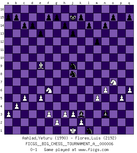 Last move : 0-1 2021 November 11 22:18:5 [Event "FICGS__BIG_CHESS__TOURNAMENT_A__000006"] [Site "FICGS"] [Date "2021.02.11"] [Round "1"] [White "Aahlad,Yeturu"] [Black "Flores,Luis"] [Result "0-1"] [WhiteElo "1990"] [BlackElo "2192"] 1.j2-k4 h15-g13 2.e2-e4 j15-k13 3.h1-o7 m15-m13 4.m2-m4 e15-e13 5.f1-b5 p16-o14 6.l1-p5 k16-h15 7.b1-c3 b16-c14 8.d2-d3 f16-b12 9.c1-l9 h16-k14 10.e4-e5 d15-d14 11.e1-e4 c16-e14 12.g1-j2 g16-j15 13.a1-e1 l16-p12 14.n2-n3 n15-n14 15.e4-f4 o16-f8 16.h2-g4 m13-m12 17.o1-g8 k13-l11 18.g4-f6 j15-k13 19.k1-h2 c14-d12 20.f6-h7 f8-h6 21.f4-h4 h6-l9 22.p5-l9 k14-f10 23.f2-f3 f10-h8 24.b5-c4 h8-l8 25.l9-g5 l8-m8 26.p1-o3 m8-h12 27.h2-g4 h12-k12 28.c3-e4 k12-b4 29.e1-b1 e14-f13 30.e4-d6 b4-b8 31.j1-h2 f13-g14 32.o7-o6 e16-e14 33.m1-e1 e14-f14 34.e1-e4 b12-c13 35.q1-e1 a16-e16 36.g4-j5 f14-f12 37.e4-f4 j16-j15 38.q2-q4 e16-e14 39.p2-p4 e14-f14 40.e1-e4 h15-j13 41.k4-l6 p12-o13 42.o6-p5 o13-p14 43.o3-n5 o14-m13 44.j2-k4 d12-c10 45.k4-j6 c10-e9 46.g8-e6 m16-m14 47.j6-g7 b8-o8 48.o2-o3 j13-h11 49.d6-e8 e9-d11 50.f4-f12 f14-f12 51.e4-f4 f12-f4 52.h4-f4 d11-f12 53.f4-f8 o8-o10 54.b1-e1 p14-h7 55.p5-p15 m14-m16 56.g5-h4 h7-p14 57.p15-q14 o10-n11 58.q14-n11 m13-n11 59.q4-q5 p14-o13 60.f8-o8 l11-m9 61.o8-o6 q16-p16 62.n5-o7 p16-p10 63.j5-l4 m16-p16 64.p4-p5 c15-c14 65.o3-o4 f12-g10 66.l4-n5 g10-f8 67.e6-d5 f8-g6 68.h4-f2 h11-j9 69.o7-m6 g6-e7 70.d5-e6 e7-c6 71.a2-a3 p10-b10 72.c4-d5 c6-d8 73.f2-h4 b10-b8 74.e6-g4 d8-e10 75.b2-b3 g13-h11 76.g4-j6 e10-g9 77.e8-f6 b8-o8 78.m6-o7 k13-l11 79.h4-n9 o8-c8 80.c2-c4 c8-b8 81.b3-b4 g9-j8 82.g7-h5 j8-l7 83.j6-l4 l7-n8 84.o6-q6 n11-l10 85.n9-h4 l10-k8 86.l6-j7 m9-n7 87.l4-n6 n8-p7 88.n3-n4 p7-n6 89.q6-n6 l11-m9 90.h4-m8 n7-o9 91.m8-l9 m9-l7 92.n6-k6 k8-l10 93.k6-l6 l7-n8 94.l9-h12 j14-j13 95.h12-e9 l15-l14 96.n5-m7 n8-p7 97.q5-q6 p7-q5 98.o4-o5 o9-m8 99.o7-m8 l10-m8 100.l6-p6 p16-p6 101.o5-p6 q5-o4 102.m7-o8 o4-p6 103.o8-p6 g14-p6 104.e1-n1 m8-n6 105.m4-m5 n6-l5 106.n4-n5 p6-l2 107.n5-n6 b8-p8 108.n1-p1 p8-m8 109.d5-h9 h11-k10 110.h9-l6 o13-d3 111.c4-c5 d3-j8 112.l6-j8 k10-j8 113.h5-k4 c13-j7 114.k4-l6 l5-k3 115.h2-j2 j7-p1 116.l6-m8 p1-n3 117.m8-o7 k3-l1 118.j2-j1 l2-k3 0-1 Follow this game move after move (download)By this measure (on the gap between Fischer & his contemporaries), I consider him the greatest world champion. (Garry Kasparov) Spielt Blackmar-Diemer-Gambit, und das Matt kommt von selbst! (Emil Joseph Diemer) No hay otro maestro que tenga una voluntad terrífica de ganar. Al tablero, el irradía peligro y aún los oponentes mas fuertes tienden a congelarse como liebres cuando olfatean a una pantera. Aún sus debilidades son peligrosas. Con las blancas, su juego de apertura es predecible - te es posible hacer planes en su contra - pero es tan fuerte que tus planes casi nunca funcionan. En el juego medio, su precisión e invención son fabulosas y en finales, tú simplemente no le puedes vencer. (Experto Alemán anónimo) Les échecs sont un jeu par leur forme, un art par leur essence et une science par sa difficulté d'acquisition. Ils peuvent vous procurer autant de plaisir qu'un bon livre ou une belle musique, mais vous n'aurez une réelle joie que si vous arrivez à bien jouer. (Tigran Petrosian) A woman without a man is like a fish without a bicycle. (Gloria Steinem)