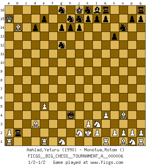 Last move : 1/2-1/2 2021 April 8 20:17:12 [Event "FICGS__BIG_CHESS__TOURNAMENT_A__000006"] [Site "FICGS"] [Date "2021.02.11"] [Round "1"] [White "Aahlad,Yeturu"] [Black "Monotua,Rotom"] [Result "1/2-1/2"] [WhiteElo "1990"] [BlackElo ""] 1.j2-k4 b15-b14 2.h1-m5 b16-c14 3.m5-o7 g15-g14 4.o7-o15 h16-a9 5.e2-e4 c16-a14 6.m2-m4 p16-o14 7.o15-j10 a16-d16 8.b1-c3 n15-n13 9.f1-b5 o16-d6 10.d2-d3 a9-g9 11.j1-h1 f16-g15 12.c1-k8 c14-e13 13.l1-o4 d15-d14 14.e4-e5 d6-c5 15.h2-g4 e13-g12 16.j10-a10 a14-l4 17.k2-k3 l4-g8 18.a10-f15 e16-f16 19.f15-a10 c5-f2 20.g4-f2 f16-f2 21.a10-a15 g8-d5 22.c3-d5 g9-g2 23.h1-j1 g2-d5 24.b5-c4 d5-g2 25.a15-c15 d16-f16 26.c4-b3 g15-c11 27.k4-j2 c11-j5 28.h3-h4 j5-a13 29.k8-j7 f16-f3 30.b3-d5 a13-l3 31.k1-l3 g2-h2 32.j1-k1 f3-j3 33.j7-b14 f2-c2 34.c15-a15 j3-d3 35.d5-e4 c2-b2 36.e4-d3 h2-h1 37.k1-k2 h1-h4 1/2-1/2 Follow this game move after move (download)You may learn much more from a game you lose than from a game you win. You will have to lose hundreds of games before becoming a good player. (Jose Raul Capablanca) In der Schule lernt man nichts. Es ist nur Zeitverschwendung. (Robert James Fischer) Un mal plan es mejor que no tener ningún plan. (Frank Marshall) Toutes choses étant égales, c'est la conviction qui gagne. Alliée à une volonté de vaincre, elle sert de détonateur, suscite des idées, disperse les doutes et aide à penser clairement. (Robert Fischer) Good luck. You're gonna need it. (Han Solo in Star Wars ep.6)