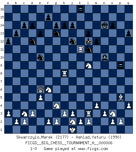 Last move : 1-0 2021 May 11 2:9:29 [Event "FICGS__BIG_CHESS__TOURNAMENT_A__000006"] [Site "FICGS"] [Date "2021.02.11"] [Round "1"] [White "Skwarczylo,Marek"] [Black "Aahlad,Yeturu"] [Result "1-0"] [WhiteElo "2177"] [BlackElo "1990"] 1.j2-k4 h15-g13 2.h1-o7 m15-m13 3.p1-o3 e15-e13 4.b1-c3 b16-c14 5.h2-g4 j15-k13 6.e2-e4 f16-b12 7.g1-j2 p16-o14 8.f1-b5 h16-k14 9.d2-d3 l16-p12 10.k1-h2 d15-d14 11.m2-m4 n15-n14 12.l1-p5 k16-h15 13.n2-n3 c16-l8 14.o1-k5 l8-m9 15.k5-n8 k13-l11 16.m1-m3 m9-n8 17.o7-n8 o14-n12 18.q1-m1 o16-c5 19.c1-e3 k14-k12 20.m3-k3 k12-f8 21.n8-k5 c5-d6 22.e4-e5 d6-b8 23.k4-h5 h15-k14 24.h5-f6 f8-b4 25.a1-b1 m13-m12 26.k5-o9 o15-o14 27.o9-b9 g15-g14 28.b9-b8 k14-j12 29.a2-a3 b4-l13 30.e3-h6 b12-h6 31.g4-h6 a16-b16 32.h2-g4 m16-m13 33.m1-m3 q16-m16 34.e1-e4 c14-d12 35.m3-l3 m13-q13 36.b1-e1 b15-b13 37.e4-a4 b16-a16 38.a4-a14 g16-e15 39.b5-g10 c15-c14 40.e1-e4 q13-q10 41.g10-j8 m16-m13 42.j8-n12 m13-n13 43.n12-j8 n13-n8 44.b8-a7 e15-c16 45.a7-m7 n8-p8 46.m7-n6 q10-p10 47.q2-q4 c16-b14 48.a14-a5 p12-m9 49.n6-n14 j16-j15 50.j8-n12 k15-k13 51.n12-p10 p8-p10 52.n14-h9 l13-o13 53.e4-a4 b14-a12 54.a5-a8 l15-l13 55.a8-h8 a15-a13 56.a4-a7 a12-c11 57.h9-o15 j15-k14 58.a7-n7 k13-k12 59.n7-n14 k14-k13 60.o15-k15 k13-l12 61.k15-p10 o13-n14 62.p10-p15 q15-q13 63.p15-p8 m9-n10 64.p8-n6 l12-k13 65.n6-q9 e16-p16 66.q9-k15 k13-l12 67.h6-j8 a16-k16 68.k15-l15 c11-e10 69.l15-e9 a13-a12 70.j8-l9 p16-p9 71.e9-e6 k12-k11 72.k3-k11 1-0 Follow this game move after move (download)Only sissies Castle. (Rob Sillars) Schach ist ein Kampf gegen den Fehler. (Johannes Herrman Zukertort) La única cosa que los jugadores de Ajedrez tienen en común, es el Ajedrez. (Lodewijk Prins) Mais l'homme est une créature légère et illogique : semblable au joueur d'échecs, il n'aime que le processus du but à atteindre, non le but lui-même. (Dostoïevsky) Men never do evil so completely and cheerfully as when they do it from religious conviction. (Blaise Pascal)