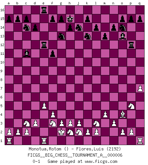Last move : 0-1 2021 April 13 15:27:5 [Event "FICGS__BIG_CHESS__TOURNAMENT_A__000006"] [Site "FICGS"] [Date "2021.02.11"] [Round "1"] [White "Monotua,Rotom"] [Black "Flores,Luis"] [Result "0-1"] [WhiteElo ""] [BlackElo "2192"] 1.g2-g3 j15-k13 2.h1-a8 b16-c14 3.d2-d3 p16-o14 4.c1-k8 e15-e13 5.f1-g2 m15-m13 6.m2-m4 l16-p12 7.l1-o4 f16-c13 8.g2-c6 d15-d14 9.n2-n3 n15-n14 10.o1-f9 e13-e12 11.e2-e4 h15-g13 12.m1-m3 k16-h15 13.m3-k3 o16-g9 14.k8-g11 h16-l13 15.f9-k13 j14-k13 16.k3-k13 l13-l12 17.a8-j8 g13-j14 18.k1-l3 g16-j15 19.k13-k4 p12-o13 20.j8-k7 m16-k16 21.p1-o3 c16-g12 22.b1-c3 g12-f11 23.c6-g10 l12-g12 24.g10-f11 e12-f11 25.e4-e5 e16-e7 26.k7-m9 h15-g13 27.g11-h10 g9-h10 28.o4-h10 e7-e10 29.h10-a3 c13-b12 30.m9-b9 g12-e12 31.b9-e12 e10-e12 32.k4-k5 a16-e16 33.f2-f4 l15-l14 34.j1-h1 j15-k13 35.h1-g2 j16-h15 36.g1-f3 e16-e14 37.q2-q4 k16-e16 38.q4-q5 e12-p12 39.k5-p5 e14-e12 40.a3-h10 p12-p5 41.o3-p5 e12-p12 42.h10-o4 e16-e12 43.q5-q6 q16-e16 44.q6-q7 b12-c11 0-1 Follow this game move after move (download)When in doubt... play Chess ! (Tevis) Zu meiner Zeit war ein 20 jähriger ein junger Spieler, heute ist er ein Veteran. (Garry Kasparov) Mi estilo es algo parecido entre un poco de Tal y Petrosian. (Reshevsky) Je menace de comprendre la position. (Anonyme) The ultimate in disposing one's troops is to be without ascertainable shape. Then the most penetrating spies cannot pry in nor can the wise lay plans against you. (Sun Tzu)