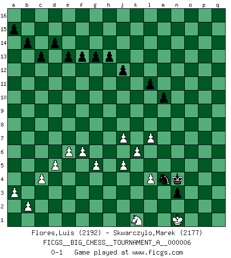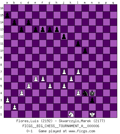 Last move : 0-1 2022 March 12 22:33:41 [Event "FICGS__BIG_CHESS__TOURNAMENT_A__000006"] [Site "FICGS"] [Date "2021.02.11"] [Round "1"] [White "Flores,Luis"] [Black "Skwarczylo,Marek"] [Result "0-1"] [WhiteElo "2192"] [BlackElo "2177"] 1.j2-k4 h15-g13 2.h2-g4 j15-k13 3.h1-o7 m15-m13 4.e2-e4 b16-c14 5.b1-c3 e15-e13 6.m2-m4 p16-o14 7.p1-o3 f16-b12 8.l1-p5 k16-h15 9.f1-b5 h16-k14 10.k1-h2 d15-d14 11.d2-d3 l16-p12 12.g1-j2 g16-j15 13.n2-n3 n15-n14 14.o1-f9 o16-f8 15.c1-l9 c16-e14 16.e4-e5 k14-j13 17.j1-k1 m16-m14 18.o7-o12 m14-l14 19.o12-p13 q16-p16 20.p13-q12 p12-o13 21.q12-m8 e14-k9 22.m8-n7 e16-e14 23.e1-e3 a16-e16 24.a1-e1 p16-m16 25.e3-f3 e14-f14 26.m1-m3 l14-l12 27.p5-o4 m16-m14 28.f9-g8 l12-n12 29.n7-j7 j13-j7 30.l9-j7 f14-f11 31.m3-l3 m14-l14 32.l3-l14 j15-l14 33.q1-m1 e16-e14 34.g8-h9 f11-j11 35.j7-l9 j11-l11 36.l9-k10 l11-l10 37.k10-j9 e14-f14 38.b5-c4 k13-j11 39.h9-f7 g13-h11 40.j9-m6 h11-g9 41.f7-k3 l14-j13 42.o4-p5 j13-g12 43.m6-l5 g9-h7 44.c3-e4 l10-b10 45.c4-b3 h7-j5 46.g4-j5 f8-j5 47.f3-f14 h15-f14 48.h2-g4 j5-c11 49.e1-e3 f14-h13 50.e3-f3 f15-f14 51.m1-m3 k9-h7 52.m3-l3 l15-l14 53.l5-n7 n12-o12 54.l3-l5 h7-o1 55.n7-l9 o12-o10 56.l9-m8 o10-l10 57.o3-n1 l10-l5 58.m4-l5 o1-c12 59.n1-m3 j11-k9 60.m8-h4 b10-f10 61.e4-f6 g12-h10 62.f3-f4 h13-j11 63.f4-c4 c12-d13 64.o2-o3 d13-h9 65.c4-b4 h9-b3 66.b4-b3 f10-a10 67.a2-a3 a10-b10 68.b3-b10 c11-b10 69.f2-f4 c14-d12 70.k3-m5 b15-b14 71.j2-l3 d12-f11 72.h4-o10 o14-n12 73.o10-m12 p15-p14 74.l3-k5 j11-l10 75.m12-k14 b12-e9 76.k14-e9 f11-e9 77.k5-h6 n12-m10 78.k4-j6 k9-j7 79.m3-k4 m10-k9 80.p5-h12 e9-c8 81.h12-k14 j16-h15 82.f6-d7 h10-f9 83.m5-e12 g15-g14 84.d7-b8 f9-e7 85.g4-f6 e7-g6 86.g2-g3 l10-m8 87.b8-c10 c15-c13 88.c10-e11 c8-d10 89.e12-m5 h15-g15 90.h6-g8 j7-g8 91.f6-g8 h14-h13 92.k14-j13 g15-f15 93.m5-d13 f15-e16 94.e11-d9 b10-d12 95.j13-e9 d10-f9 96.g8-f10 f9-e11 97.d9-e11 d12-e11 98.f10-e12 e16-e15 99.e9-f10 e11-f10 100.e12-f10 j14-j13 101.d13-e12 f14-f13 102.e12-m5 e15-f14 103.f10-h11 k15-k14 104.h11-j9 l14-l13 105.k1-j2 j13-j12 106.j2-h2 g6-e7 107.h2-g2 k9-j7 108.g2-f2 e7-f5 109.c2-c3 f5-e7 110.d3-d4 g14-g13 111.j6-g7 e7-d5 112.f4-f5 o13-k9 113.c3-c4 d5-e7 114.g3-g4 e7-c6 115.f2-e3 k9-j10 116.g7-e6 c6-a5 117.e3-d3 m8-n6 118.j9-k7 n6-l7 119.m5-l4 j10-h9 120.k7-j9 j7-l6 121.k4-l6 h9-l6 122.e6-g5 l7-m5 123.n3-n4 m5-n3 124.l4-m3 n3-p2 125.l2-l3 a5-c6 126.j3-j4 l6-n8 127.j9-g10 n8-q5 128.g10-j11 f14-g14 129.j11-k13 q5-o3 130.k13-m14 o15-o14 131.m14-l16 p2-n1 132.m3-k1 o3-p4 133.l16-k14 n1-o3 134.k14-m15 o14-o13 135.m15-o16 n14-n13 136.o16-q15 n13-n12 137.q15-o16 p14-p13 138.o16-n14 p13-p12 139.n14-p15 o13-o12 140.p15-q13 o12-o11 141.q13-o14 o3-q2 142.o14-p12 c6-e7 143.k1-m3 p4-j10 144.p12-o14 q2-p4 145.m3-n2 p4-o2 146.n4-n5 n12-n11 147.o14-m15 l13-l12 148.m15-n13 o11-o10 149.n13-p12 m13-m12 150.j4-j5 o2-p4 151.p12-q14 n11-n10 152.n2-j6 m12-m11 153.q14-p12 p4-n5 154.p12-o10 n5-l6 155.k2-k4 l6-k8 156.j6-h5 g14-h14 157.g5-f7 h14-j13 158.f7-h8 j10-h9 159.h8-k9 j13-k12 160.d4-d5 e7-f9 161.k9-j7 h9-j10 162.f5-f6 f9-h8 163.d3-e3 k12-l11 164.e3-f4 l11-m10 165.o10-n8 m10-l10 166.e5-e6 j10-m7 167.h5-j4 m7-j4 168.h3-j4 l10-m9 169.n8-o6 n10-n9 170.f4-g3 n9-n8 171.g3-h2 n8-n7 172.o6-n4 m9-n8 173.k4-k5 n8-o7 174.h2-j3 o7-p6 175.j3-k3 p6-o5 176.n4-m2 h8-k7 177.k3-k4 n7-n6 178.j7-l8 k8-m9 179.l5-l6 k7-m8 180.k4-l4 m8-o7 181.l4-m4 o5-o4 182.m4-m3 l12-l11 183.l3-l4 o7-p5 184.l8-m6 m9-n7 185.l6-l7 n6-n5 186.j5-j6 n7-p8 187.m3-n2 p8-o6 188.m2-o1 p5-n4 189.m6-n4 o6-n4 190.j4-j5 n4-l5 191.o1-m2 m11-m10 192.j6-j7 n5-n4 193.g4-g5 l5-n6 194.k5-k6 n6-m4 195.n2-n1 n4-n3 196.m2-k1 o4-n4 0-1 Follow this game move after move (download)Chess teaches you to control the initial excitement you feel when you see something that looks good and it trains you to think objectively when you're in trouble. (Stanley Kubrick) Ohne ihre Erfolge schmälern zu wollen würde ich sagen Petrosian, Spassky und Karpov verdanken ihre Siege ihren Trainern - Boleslavsky, Bondarevsky und Furman. (Mikhail Moiseyevich Botvinik) Cuando me preguntan: -¿Cual es el secreto que te hace hacer mejores movidas que tus oponentes?, Yo respondo: Me da gusto que me pregunten eso, porque, como veran, hay una simple razón. Yo pienso mis propias movidas y dejo a mi oponente que el piense las suyas. (Alexander Alekhine) J'ai vu le vaincu d'Echecs jouer des années durant dans l'espoir de la fête de la victoire. Car tu es plus riche de ce qu'elle existe si même elle n'est point pour toi. Ainsi de la perle du fond des mers. (Antoine de Saint-Exupéry) There is a computer disease that anybody who works with computers knows about. It's a very serious disease and it interferes completely with the work. The trouble with computers is that you 'play' with them ! (Richard P. Feynman)
