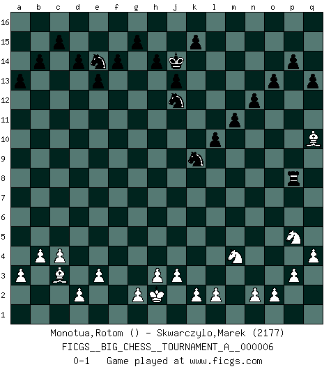 Last move : 0-1 2021 April 13 7:50:8 [Event "FICGS__BIG_CHESS__TOURNAMENT_A__000006"] [Site "FICGS"] [Date "2021.02.11"] [Round "1"] [White "Monotua,Rotom"] [Black "Skwarczylo,Marek"] [Result "0-1"] [WhiteElo ""] [BlackElo "2177"] 1.b2-b3 j15-k13 2.c1-b2 h16-o10 3.p1-o3 o10-f2 4.g1-f3 f2-p11 5.p2-p3 b15-b14 6.o1-p2 c16-b15 7.m2-m4 o15-o14 8.c2-c4 n15-n13 9.b1-c3 h15-g13 10.l1-m2 o16-g9 11.m2-k4 e15-e13 12.h1-g1 f16-c13 13.g1-b6 g9-m4 14.b6-b9 k16-h15 15.m1-m4 c13-m4 16.o3-m4 b15-p2 17.q1-m1 p2-b15 18.e2-e3 m15-m13 19.f1-d3 p16-q14 20.e1-f1 l16-o13 21.d3-k9 p11-n9 22.k9-f5 n9-b9 23.f5-b9 g16-j15 24.c3-d5 b16-a14 25.f3-g5 a14-c13 26.f1-f6 m13-m12 27.a1-f1 k13-l11 28.f6-m6 j15-k13 29.f1-f8 j16-j15 30.m4-l6 o13-p14 31.l6-k8 q14-p12 32.h2-g4 p12-n11 33.g5-f7 m16-m14 34.f7-h8 q16-m16 35.h8-j10 l11-j10 36.k8-j10 m14-l14 37.k1-l3 m16-m14 38.k4-h6 l14-l10 39.j10-k12 l10-n10 40.d5-f6 h15-k14 41.f6-e8 k14-m13 42.k12-m13 n11-m13 43.m1-m4 m14-l14 44.g4-f6 e16-e14 45.f6-g8 e14-d14 46.b2-c3 d14-d9 47.e8-c7 d9-q9 48.q2-q4 l14-l7 49.m6-m7 l7-m7 50.m4-m7 m13-l11 51.a2-a3 f15-f14 52.b9-g14 n10-o10 53.h6-j7 k13-h12 54.g14-p6 o10-o8 55.c7-e6 q9-q8 56.p6-m3 l11-k9 57.j7-m4 q8-p8 58.m3-q7 p8-p10 59.j1-h2 p10-e10 60.m7-m6 b15-h9 61.g8-j7 o8-f8 62.e6-f8 e10-q10 63.f8-h9 q10-q7 64.j7-k9 p14-k9 65.m6-p6 p15-p14 66.p6-o6 o14-o13 67.h9-j11 k9-j10 68.o6-l6 a16-l16 69.j11-l12 j10-l12 70.l6-l12 h12-k13 71.l12-l8 c13-e14 72.l8-n8 n13-n12 73.n8-a8 a15-a13 74.a8-d8 d15-d14 75.d8-m8 l15-l13 76.j2-h4 m12-m11 77.l3-m5 l13-l12 78.m5-o6 q7-q9 79.o6-m7 l12-l11 80.m7-o8 q9-q10 81.m4-h8 l11-l10 82.h8-n13 q10-q6 83.n13-o12 l16-l12 84.o12-j7 k13-l11 85.j7-n3 q6-q8 86.n3-l5 q8-p8 87.m8-m10 l11-k9 88.m10-q10 q15-q13 89.o8-p10 l12-b12 90.b3-b4 b12-b6 91.h4-k5 b6-n6 92.k5-m4 n6-n10 93.p10-q8 n10-q10 94.l5-q10 j14-j13 95.q8-o7 j15-j14 96.o7-p5 g13-j12 0-1 Follow this game move after move (download)A man that will take back a move at Chess will pick a pocket. (Richard Fenton) Computer sind die einzigen Gegner, die nicht immer eine Ausrede auf Lager haben, wenn sie gegen mich verlieren. (Robert James Fischer) El Ajedrez es imaginación. (David Bronstein) Echiquier : carré parfait, comme la Jérusalem nouvelle décrite par l'auteur de l'Apocalypse, huit cases sur huit, exaltation du chiffre 4, symbole du cosmos aux quatre horizons... où le noir et le blanc, l'ombre et la lumière, le mal et le bien s'entremêlent et se conjuguent. (Robert Couffignal, Le Gambit du poète) Panic is a sudden desertion of us, an a going over to the enemy of our imagination. (Christian Nevell Bovee)