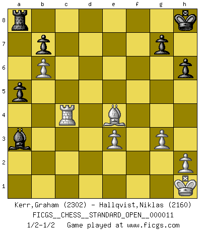 Last move : 1/2-1/2 2021 September 17 0:9:26 [Event "FICGS__CHESS__STANDARD_OPEN__000011"] [Site "FICGS"] [Date "2021.02.12"] [Round "1"] [White "Kerr,Graham"] [Black "Hallqvist,Niklas"] [Result "1/2-1/2"] [WhiteElo "2302"] [BlackElo "2160"] 1.d4 e6 2.Nf3 Nf6 3.g3 c5 4.c4 cxd4 5.Nxd4 d5 6.Bg2 e5 7.Nf3 d4 8.O-O Nc6 9.e3 Be7 10.exd4 exd4 11.b4 Nxb4 12.Nxd4 O-O 13.Be3 Ng4 14.Nc3 Nxe3 15.fxe3 Rb8 16.a3 Na6 17.Qe2 Bd7 18.Rad1 Qe8 19.Ndb5 Bc5 20.Nd5 Kh8 21.Kh1 f6 22.Rf4 Qf7 23.Rdf1 Bxb5 24.cxb5 Nc7 25.Nxc7 Qxc7 26.Be4 Qe5 27.Rh4 f5 28.Qh5 h6 29.Rxf5 Rxf5 30.Qxf5 Qxf5 31.Bxf5 Rf8 32.Bg6 Bxa3 33.Rc4 a5 34.b6 Ra8 35.Be4 1/2-1/2 Queen's pawn Kingside Castling by player White (move 8) Kingside Castling by player Black (move 12) This chess game ended in a draw. Follow this game move after move (download)There just isn't enough televised Chess. (David Letterman) Drei Punkte vor allen anderen ist wie einer, der im weißen Anzug posiert, während der Rest in Müllsäcke gekleidet dasteht. (Viktor Kortschnoi) En un gambito tu regalas un Peón por el bién de tomar un juego perdido. (Samuel Standige Boden) Les écrivains ont utilisé les échecs pour analyser les côtés extrêmes de la nature humaine. Dans ce cadre, les échecs offrent un champ d'expérimentation idéal. Mais on pourrait faire la même chose avec la peinture. Et là, en vous référant à Van Gogh, vous ne tirerez pas de conclusion définitive sur les peintres. (Gary Kasparov) If you ain't just a little scared when you enter a casino, you are either very rich or you haven't studied the games enough. (Pappy)