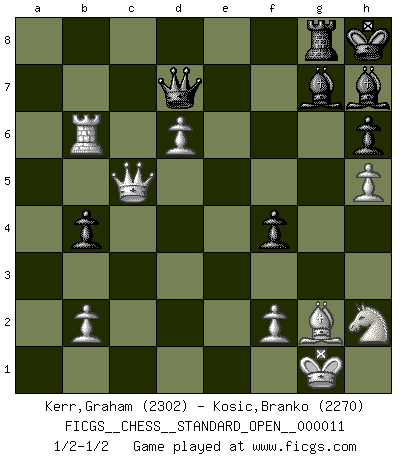Last move : 1/2-1/2 2021 September 18 0:6:58 [Event "FICGS__CHESS__STANDARD_OPEN__000011"] [Site "FICGS"] [Date "2021.02.12"] [Round "2"] [White "Kerr,Graham"] [Black "Kosic,Branko"] [Result "1/2-1/2"] [WhiteElo "2302"] [BlackElo "2270"] 1.d4 f5 2.Nf3 Nf6 3.g3 g6 4.c4 Bg7 5.Bg2 O-O 6.O-O d6 7.Nc3 c6 8.Be3 Ng4 9.Bg5 h6 10.Bc1 Na6 11.e4 fxe4 12.Nxe4 g5 13.h3 Nf6 14.Nxf6+ exf6 15.Re1 Bf5 16.d5 c5 17.Bd2 Qd7 18.Qb3 b6 19.Nh2 Bg6 20.a4 Rfe8 21.Re6 Nc7 22.h4 Bf5 23.Rxe8+ Rxe8 24.Ra3 Bg6 25.Qd1 Na6 26.h5 Bh7 27.a5 Nb4 28.axb6 axb6 29.Bxb4 cxb4 30.Ra6 f5 31.Rxb6 f4 32.gxf4 gxf4 33.c5 dxc5 34.d6 Rd8 35.Qd5+ Kh8 36.Qxc5 Rg8 1/2-1/2 Dutch Kingside Castling by player Black (move 5) Kingside Castling by player White (move 6) This chess game ended in a draw. Follow this game move after move (download)Chess is a foolish expedient for making idle people believe they are doing something very clever when they are only wasting their time. (George Bernard Shaw) Du musst Deinen Gegner in einen tiefen dunklen Wald führen wo 2+2=5 ist und wo der Weg, der wieder hinausführt, nur breit genug für einen ist. (Mikhail Nekhemyevich Tal) Con el fin de mejorar tu juego, debes de estudiar los finales antes que todo, ya que mientras que los finales pueden ser estudiados y dominados por sí mismos, el juegomedio y la apertura deben de ser estudiados en relación con los finales. (José Raúl Capablanca) Avant la finale, les dieux ont créé le milieu de partie. (Tarrasch) Logic : The art of thinking and reasoning in strict accordance with the limitations and incapacities of the human misunderstanding. (Ambrose Bierce)