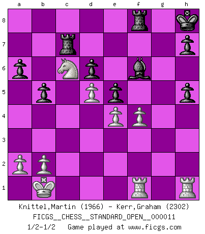 Last move : 1/2-1/2 2021 May 23 5:12:19 [Event "FICGS__CHESS__STANDARD_OPEN__000011"] [Site "FICGS"] [Date "2021.02.12"] [Round "2"] [White "Knittel,Martin"] [Black "Kerr,Graham"] [Result "1/2-1/2"] [WhiteElo "1966"] [BlackElo "2302"] 1.e4 c5 2.Nf3 d6 3.d4 cxd4 4.Nxd4 Nf6 5.Nc3 a6 6.Be3 e5 7.Nb3 Be6 8.f3 Be7 9.Qd2 O-O 10.O-O-O Nbd7 11.g4 b5 12.g5 Nh5 13.Nd5 Bxd5 14.exd5 f6 15.gxf6 Bxf6 16.Kb1 Nb6 17.Na5 Qc7 18.Qb4 Nf4 19.Qe4 Rac8 20.h4 Kh8 21.Bxb6 Qxb6 22.Nc6 g6 23.Bd3 Rc7 24.Qe1 Nxd3 25.cxd3 Qc5 26.Qe4 Qf2 27.h5 gxh5 28.Rdf1 Qg2 29.f4 Qxe4 30.dxe4 1/2-1/2 Sicilian : Najdorf, Byrne (English) attack Kingside Castling by player Black (move 9) Queenside Castling by player White (move 10) This chess game ended in a draw. Follow this game move after move (download)Nowadays, when you're not a grandmaster at 14, you can forget about it. (Anand Viswanathan) Ein Gewinn durch eine ungenaue Kombination, sei sie auch noch so vorzeigbar, erfüllt mich mit Schaudern. (Wilhelm Steinitz) El jugador blanco perdió porque fallo en recordar la coreccta continuación y tuvo que pensar por sí mismo las movidas. (Siegbert Tarrasch) Ne tendez aucun piège pour le plaisir ! Ne jouez rien dans l'espoir que l'adversaire réagisse de façon stupide ! Prenez toujours pour acquis que l'adversaire va trouver le meilleur coup ! Ne jouez jamais de coup dans l'espoir que l'adversaire ne voie pas la menace ! Chacun de vos coups doit améliorer la position d'une façon ou d'une autre. Programmer - an organism that turns coffee into software. (Anonymous)