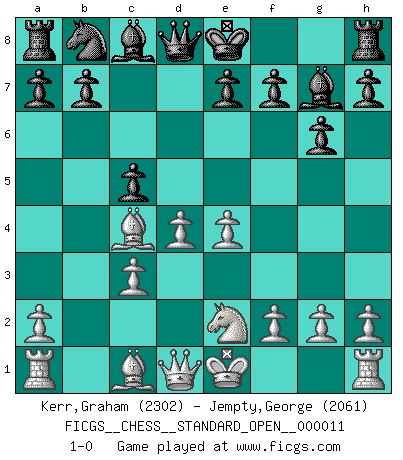 Last move : 1-0 2021 April 6 0:1:51 [Event "FICGS__CHESS__STANDARD_OPEN__000011"] [Site "FICGS"] [Date "2021.02.12"] [Round "2"] [White "Kerr,Graham"] [Black "Jempty,George"] [Result "1-0"] [WhiteElo "2302"] [BlackElo "2061"] 1.d4 Nf6 2.c4 g6 3.Nc3 d5 4.cxd5 Nxd5 5.e4 Nxc3 6.bxc3 Bg7 7.Bc4 c5 8.Ne2 1-0 This chess game has been lost on time (started : 2021.02.12 4:6:8) King's Indian defense, 3.Nc3 Player White won this chess game. Follow this game move after move (download)Any material change in a position must come about by mate, a capture, or a Pawn promotion. (Purdy) Wenn ich einen Club besuche, sind die Spieler stumm vor Staunen. (José Raúl Capablanca) En posiciones complicadas, Bobby Fischer pocas veces tuvo que temer de cualquiera. (Paul Keres) Le temps de noter son nom sur la feuille de partie, j'étais déjà en zeitnot ! D'un modeste amateur apparié lors de la première ronde d'un open contre le grand-maître Azmaïparashvili. I don't diet. I just don't eat as much as I'd like to. (Linda Evangelista, supermodel)