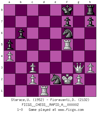 Last move : 1-0 2006 August 15 19:15:45 [Event "FICGS__CHESS__RAPID_A__000002"] [Site "FICGS"] [Date "2006.06.23"] [Round "1"] [White "Starace,Umberto"] [Black "Fioravanti,Diego"] [Result "1-0"] [WhiteElo "1952"] [BlackElo "2132"] 1.e4 c5 2.Nf3 e6 3.d4 cxd4 4.Nxd4 d6 5.Nc3 a6 6.Be2 Nf6 7.O-O Nbd7 8.a4 b6 9.f4 Bb7 10.Bf3 Rc8 11.Qe1 Rc4 12.Be3 Qc7 13.Bf2 e5 14.fxe5 dxe5 15.Nf5 g6 16.Ne3 Rxc3 17.bxc3 Bxe4 18.Qe2 Bxf3 19.Qxf3 e4 20.Qe2 Bd6 21.h3 a5 22.Bh4 Nh5 23.Kh1 Bg3 24.Nf5 Bxh4 25.Qxe4+ Kf8 26.Qxh4 Ndf6 27.Rad1 gxf5 28.Rxf5 Ng3 29.Kg1 Ne2 30.Kf2 Qg3 31.Qxg3 1-0 Sicilian defense Kingside Castling by player White (move 7) Player White won this chess game. Follow this game move after move (download)Excellence at Chess is one mark of a scheming mind. (Sir Arthur Conan Doyle) Es gibt Leute, die glauben, alles wäre vernünftig, was man mit einem ernsthaften Gesicht tut. (Georg Christoph Lichtenberg) Si un gobernante no entiende al Ajedrez, ¿como puede governar él un reinado?. (El Rey Khusros II) L'attaque fait le spectacle, la défense gagne les matchs. (Dicton footballistique) There are more things in heaven and earth than practically anywhere else. (Unknown)