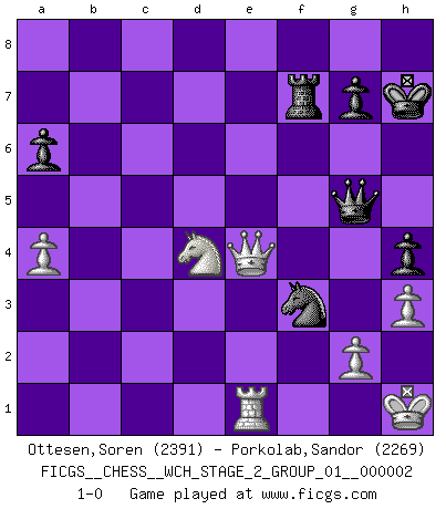 Last move : 1-0 2007 October 15 22:40:1 [Event "FICGS__CHESS__WCH_STAGE_2_GROUP_01__000002"] [Site "FICGS"] [Date "2007.07.11"] [Round "1"] [White "Ottesen,Soren"] [Black "Porkolab,Sandor"] [Result "1-0"] [WhiteElo "2391"] [BlackElo "2269"] 1.e4 c5 2.Nf3 d6 3.d4 cxd4 4.Nxd4 Nf6 5.Nc3 a6 6.f3 Qb6 7.Nb3 e6 8.Qe2 Qc7 9.Be3 b5 10.a3 Bb7 11.Qf2 Nbd7 12.Qg3 Rc8 13.Bd3 Be7 14.O-O O-O 15.Bh6 Ne8 16.Be3 Ne5 17.Rad1 Nf6 18.Qf2 Nxd3 19.cxd3 Nd7 20.Rc1 Qd8 21.Na2 Rxc1 22.Rxc1 f5 23.Qc2 fxe4 24.dxe4 Ne5 25.Nd4 Bg5 26.Bxg5 Qxg5 27.Qe2 Rc8 28.Rd1 Qf6 29.Nb4 h5 30.Nbc2 h4 31.Ne3 Qh6 32.h3 Re8 33.Qf2 Rf8 34.Qd2 Rc8 35.b3 Rf8 36.Rc1 Rf7 37.Rc2 Qf6 38.Kh1 Rd7 39.Qe1 Ng6 40.Qc3 Ne5 41.Rc1 Rf7 42.a4 bxa4 43.bxa4 d5 44.exd5 Bxd5 45.Nxd5 exd5 46.Re1 Kh7 47.Qb3 Qg5 48.Qxd5 Nxf3 49.Qe4+ 1-0 Sicilian : Najdorf Kingside Castling by player White (move 14) Kingside Castling by player Black (move 14) Player White won this chess game. Follow this game move after move (download)After black's reply to 1.e4 with 1..e5, leaves him always trying to get into the game. (Howard Staunton) Jeder leidlich begabte Spieler, er braucht keineswegs hervorragend veranlagt zu sein, kann es zum Meister bringen. Aber das ist ja auch gar nicht nötig! Der richtige Standpunkt ist es, zu seinem Vergnügen zu spielen, und man glaube ja nicht, dass der Genuss proportional dem Können sei. (Siegbert Tarrasch) Coloca el contenido de las piezas del Ajedrez en un sombrero, agitalo vigorosamente, arrojalas en un tablero desde una altura de 30 centimetros y así obtendras el estilo de Steinitz. (H. E. Bird) A chaque perte on perd un peu de soi. (Joël Lautier) If we knew what we were doing, we would not call it research. (Albert Einstein)