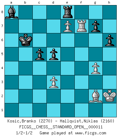 Last move : 1/2-1/2 2022 March 12 22:48:27 [Event "FICGS__CHESS__STANDARD_OPEN__000011"] [Site "FICGS"] [Date "2021.02.12"] [Round "2"] [White "Kosic,Branko"] [Black "Hallqvist,Niklas"] [Result "1/2-1/2"] [WhiteElo "2270"] [BlackElo "2160"] 1.e4 e6 2.d3 c5 3.g3 Be7 4.Bg2 d5 5.Nd2 Nc6 6.Ngf3 Nf6 7.O-O O-O 8.Re1 h6 9.e5 Nd7 10.Nf1 b5 11.h4 b4 12.N1h2 Re8 13.Bf4 Bb7 14.Qd2 a5 15.Ng4 Bf8 16.a4 Ne7 17.h5 Rc8 18.b3 Rc7 19.Ne3 Nb6 20.Qe2 Kh8 21.Qd1 Nc6 22.Ng4 Nd7 23.Qd2 Be7 24.Rad1 Nf8 25.Qe2 Nh7 26.Bc1 Rf8 27.Bb2 Qc8 28.Kh2 Ba6 29.Ne3 f5 30.exf6 Bxf6 31.Bxf6 Nxf6 32.Nh4 Nd4 33.Ng6+ Kg8 34.Qd2 Re8 35.Ne5 Nxh5 36.c3 bxc3 37.Qxc3 Qb7 38.f4 Nf6 39.Qxa5 Rb8 40.Rb1 Qc8 41.Rb2 Nxb3 42.Reb1 Nxa5 43.Rxb8 Nc6 44.Rxc8+ Bxc8 45.Nxc6 Rxc6 46.Nc4 Kf8 47.Ne5 Rc7 48.a5 Ke7 49.Rb6 Nd7 50.Nxd7 Bxd7 51.a6 Bc6 52.a7 Ba8 53.Ra6 Rc6 54.Ra5 Kd7 55.g4 Kc7 56.f5 Kb6 57.Ra2 Rc8 58.fxe6 Re8 59.Rf2 Kxa7 60.Rf7+ Kb6 61.e7 1/2-1/2 French : King's Indian attack Kingside Castling by player White (move 7) Kingside Castling by player Black (move 7) This chess game ended in a draw. Follow this game move after move (download)One bad move nullifies forty good ones. (Horowitz) Wer der Ansicht ist, daß alle Schachspieler verrückt sind, wird durch Studium des Lebens von Emil Josef Diemer nicht auf andere Gedanken kommen. (Hans Ree) Buenas posiciones no logran ganar juegos, buenas movidas sí. (Gerald Abrahams) J'ai toujours senti une vague pitié pour l'homme qui ne connaît rien aux échecs, tout comme j'en aurais pour un homme ignorant de l'amour. Les Echecs, comme la musique ou comme l'amour, ont le pouvoir de rendre heureux. (Siegbert Tarrasch) Live, lose, and learn, by observing your opponent how to win. (Amber Steenbock)