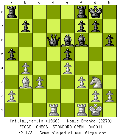Last move : 1/2-1/2 2021 April 29 12:32:59 [Event "FICGS__CHESS__STANDARD_OPEN__000011"] [Site "FICGS"] [Date "2021.02.12"] [Round "2"] [White "Knittel,Martin"] [Black "Kosic,Branko"] [Result "1/2-1/2"] [WhiteElo "1966"] [BlackElo "2270"] 1.e4 c5 2.Nc3 Nc6 3.Nge2 Nd4 4.Nxd4 cxd4 5.Ne2 e5 6.c3 dxc3 7.dxc3 Nf6 8.Ng3 Bc5 9.b4 Be7 10.Bc4 Qc7 11.Qd3 O-O 12.O-O d6 13.Bg5 h6 14.Bxf6 Bxf6 15.Bb3 a5 16.Rad1 Bg4 17.f3 Be6 18.Qxd6 Qxd6 1/2-1/2 Sicilian : chameleon variation Kingside Castling by player Black (move 11) Kingside Castling by player White (move 12) This chess game ended in a draw. Follow this game move after move (download)Morphy was probably the greatest genius of them all. (Bobby Fischer) Schach verlangt totale Konzentration. (Robert James Fischer) Tu sabes que vas a perder. Aún cuando tenía la ventaja, yo sabía que iba a perder. - al estar jugando con Fischer (Andrew Soltis) Je menace de comprendre la position. (Anonyme) Perhaps the current trend of many chess professionals taking up the more lucrative pastime of poker is not a wholly negative one. It may not be too late for humans to relearn how to take risks in order to innovate and thereby maintain the advanced lifestyles we enjoy. And if it takes a poker-playing supercomputer to remind us that we can't enjoy the rewards without taking the risks, so be it. (The Chess Master and the Computer, by Garry Kasparov - 2010)