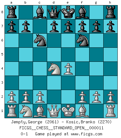 Last move : 0-1 2021 April 7 1:16:33 [Event "FICGS__CHESS__STANDARD_OPEN__000011"] [Site "FICGS"] [Date "2021.02.12"] [Round "1"] [White "Jempty,George"] [Black "Kosic,Branko"] [Result "0-1"] [WhiteElo "2061"] [BlackElo "2270"] 1.e4 c5 2.Nf3 Nc6 3.d4 cxd4 4.Nxd4 Nf6 0-1 This chess game has been lost on time (started : 2021.02.12 4:6:8) Sicilian defense Player Black won this chess game. Follow this game move after move (download)Pawns are born free, yet they are everywhere in chains. (Rick Kennedy) Jeder Schachmeister war einmal ein Anfänger. (Irving Chernev) Cuando la partida de Ajedrez termina, el Peón y el Rey regresan a la misma caja. (Irish saying) Aucun coup ne doit être joué sans but. (Pedro Damiano) Imagination is more important than knowledge. Knowledge is limited. Imagination encircles the world. (Albert Einstein)