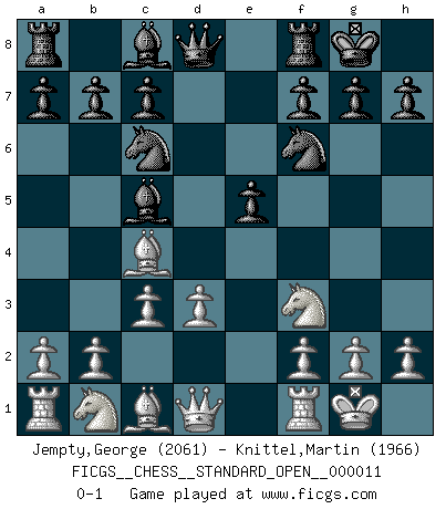 Last move : 0-1 2021 April 3 6:58:4 [Event "FICGS__CHESS__STANDARD_OPEN__000011"] [Site "FICGS"] [Date "2021.02.12"] [Round "2"] [White "Jempty,George"] [Black "Knittel,Martin"] [Result "0-1"] [WhiteElo "2061"] [BlackElo "1966"] 1.e4 e5 2.Nf3 Nc6 3.Bb5 Nf6 4.d3 Bc5 5.c3 O-O 6.O-O d5 7.exd5 Qxd5 8.Bc4 Qd8 0-1 This chess game has been lost on time (started : 2021.02.12 4:6:8) Ruy Lopez : Berlin defense Kingside Castling by player Black (move 5) Kingside Castling by player White (move 6) Player Black won this chess game. Follow this game move after move (download)The most powerful weapon in Chess is to have the next move. (David Bronstein) Ich organisiere ein großes Turnier, was mich etwa 120000 Dollar kostet. Ich denke, das ist das erste Mal in der Schachgeschichte, daß ein Schachgroßmeister auch als Mäzen auftritt. (Miguel Najdorf) La estratégia requiere pensar, la táctica requiere observación. (Max Euwe) Echiquier : carré parfait, comme la Jérusalem nouvelle décrite par l'auteur de l'Apocalypse, huit cases sur huit, exaltation du chiffre 4, symbole du cosmos aux quatre horizons... où le noir et le blanc, l'ombre et la lumière, le mal et le bien s'entremêlent et se conjuguent. (Robert Couffignal, Le Gambit du poète) Question: Is 'This statement is paradoxical' a paradoxical statement ? Or is it a meta-paradox ? (Normajean Yates)