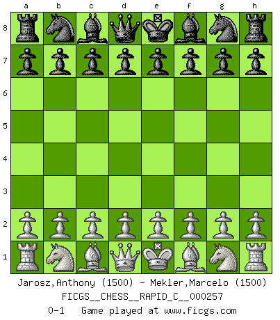Last move : 0-1 2021 March 18 13:2:15 [Event "FICGS__CHESS__RAPID_C__000257"] [Site "FICGS"] [Date "2021.02.16"] [Round "1"] [White "Jarosz,Anthony"] [Black "Mekler,Marcelo"] [Result "0-1"] [WhiteElo "1500"] [BlackElo "1500"] 0-1 This chess game has been lost on time (started : 2021.02.16 8:1:34) Player Black won this chess game. Follow this game move after move (download)A Chess game is divided into three stages: the first, when you hope you have the advantage, the second when you believe you have an advantage, and the third... when you know you're going to lose ! (Savielly Tartakower) Wenn du gegen Bobby spielst, ist es keine Frage von gewinnen oder verlieren. Es ist eine Frage des Überlebens. (Boris Vassilievich Spassky) En posiciones complicadas, Bobby Fischer pocas veces tuvo que temer de cualquiera. (Paul Keres) Pour se monter efficace, un Cavalier a besoin d'avant-postes ! Les Cavaliers font les meilleurs bloqueurs de pions passés. The large trees attract high winds. (Chinese proverb)