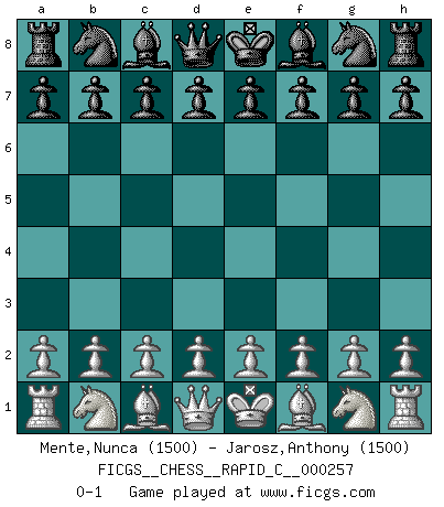 Last move : 0-1 2021 March 18 13:2:15 [Event "FICGS__CHESS__RAPID_C__000257"] [Site "FICGS"] [Date "2021.02.16"] [Round "1"] [White "Mente,Nunca"] [Black "Jarosz,Anthony"] [Result "0-1"] [WhiteElo "1500"] [BlackElo "1500"] 0-1 This chess game has been lost on time (started : 2021.02.16 8:1:34) Player Black won this chess game. Follow this game move after move (download)I am the best player in the world and I am here to prove it. (Bobby Fischer) Die Neutralität betrachte ich als eine schwere Krankheit. (Viktor Kortschnoi) Es muy difícil jugar en contra de la teoría de Einstein. - en su primera derrota en contra de Fischer (Mikhail Tal) Avant la finale, les dieux ont créé le milieu de partie. (Tarrasch) Real knowledge is to know the extent of one's ignorance. (Confucius)