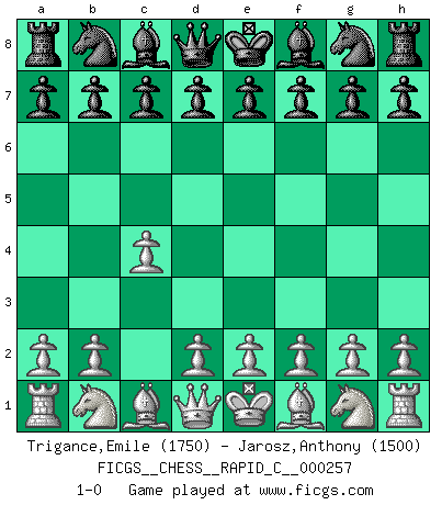 Last move : 1-0 2021 March 18 13:2:15 [Event "FICGS__CHESS__RAPID_C__000257"] [Site "FICGS"] [Date "2021.02.16"] [Round "1"] [White "Trigance,Emile"] [Black "Jarosz,Anthony"] [Result "1-0"] [WhiteElo "1750"] [BlackElo "1500"] 1.c4 1-0 This chess game has been lost on time (started : 2021.02.16 8:1:34) English Opening Player White won this chess game. Follow this game move after move (download)Could we look into the head of a Chess player, we should see there a whole world of feelings, images, ideas, emotion and passion. (Alfred Binet) Wie kann ich Remis annehmen? Ich weiß ja gar nicht, wie ich stehe! (Fritz Sämisch) El Ajedrez es el juego mas altamente simbólico, pero las agresiones estan por lo tanto aún mas francamente representadas en la partida. Tal vez comenzo como un juego de guerra; Algo como la representación de una batalla en miniatura entre las fuerzas de dos reinos. (Karl Meninger) Il vaut toujours mieux jouer un plan faux de façon logique que de n'avoir pas de plan du tout. (Victor Kortchnoï) Humor is by far the most significant activity of the human brain. (Edward De Bono)