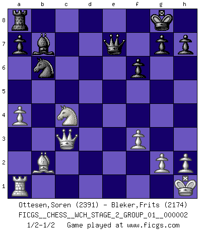 Last move : 1/2-1/2 2007 August 7 11:21:29 [Event "FICGS__CHESS__WCH_STAGE_2_GROUP_01__000002"] [Site "FICGS"] [Date "2007.07.11"] [Round "1"] [White "Ottesen,Soren"] [Black "Bleker,Frits"] [Result "1/2-1/2"] [WhiteElo "2391"] [BlackElo "2174"] 1.e4 c6 2.d4 d5 3.exd5 cxd5 4.c4 Nf6 5.Nc3 e6 6.Nf3 Bb4 7.a3 Bxc3+ 8.bxc3 O-O 9.Bd3 dxc4 10.Bxc4 Qc7 11.Qd3 Nbd7 12.O-O b6 13.Re1 Bb7 14.Nd2 Nd5 15.f3 Nxc3 16.Qxc3 b5 17.d5 bxc4 18.dxe6 Nb6 19.e7 Qc5+ 20.Kh1 Rfe8 21.Bb2 f6 22.a4 Rxe7 23.Rxe7 Qxe7 24.Nxc4 1/2-1/2 Caro-Kann : Panov-Botvinnik attack, 5...e6 Kingside Castling by player Black (move 8) Kingside Castling by player White (move 12) This chess game ended in a draw. Follow this game move after move (download)First-class players lose to second-class players because second-class players sometimes play a first-class game. (Siegbert Tarrasch) Jede Eröffnung ist gut genug um gespielt zu werden, wenn nur ihr Ruf schlecht genug ist. (Savielly Grigorievitsch Tartakower) Yo he agregado estos principios a la ley: pongan los Caballos en acción antes de que los dos Alfiles sean desarrollados. (Emanuel Lasker) Soyez une menace à chaque fois que vous vous asseyez pour jouer. (Ken Smith) If you ain't just a little scared when you enter a casino, you are either very rich or you haven't studied the games enough. (Pappy)
