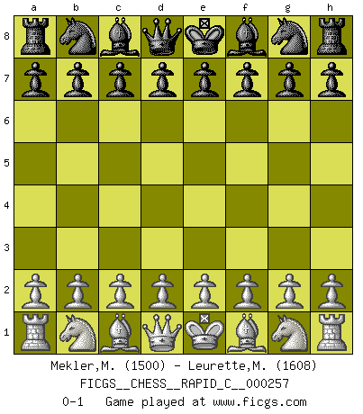Last move : 0-1 2021 March 18 13:2:15 [Event "FICGS__CHESS__RAPID_C__000257"] [Site "FICGS"] [Date "2021.02.16"] [Round "1"] [White "Mekler,Marcelo"] [Black "Leurette,Marc-Antoine"] [Result "0-1"] [WhiteElo "1500"] [BlackElo "1608"] 0-1 This chess game has been lost on time (started : 2021.02.16 8:1:34) Player Black won this chess game. Follow this game move after move (download)Good positions don't win games, good moves do. (Gerald Abrahams) Eine Person mit durchschnittlichem IQ kann etwa eine ELO von 2000 erreichen. (Jonathan Levitt) Un sacrificio se refuta mucho mejor al aceptarlo. (Wilhelm Steinitz) À la honte des hommes, on sait que les lois du jeu sont les seules qui soient partout justes, claires, inviolables et exécutées. Pourquoi l'Indien qui a donné les règles du jeu d'échecs est-il obéi de bon gré dans toute la terre, et que les décrétales des papes, par exemple, sont aujourd'hui un objet d'horreur et de mépris ? C'est que l'inventeur des échecs combina tout avec justesse pour la satisfaction des joueurs, et que les papes, dans leurs décrétales, n'eurent en vue que leur seul avantage. L'Indien voulut exercer également l'esprit des hommes et leur donner du plaisir; les papes ont voulu abrutir l'esprit des hommes. Voltaire (Dictionnaire philosophique / Garnier 1967) In theory there is no difference between theory and practice. In practice there is. (Yogi Berra)