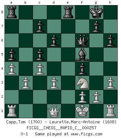 Last move : 0-1 2021 April 10 12:10:54 [Event "FICGS__CHESS__RAPID_C__000257"] [Site "FICGS"] [Date "2021.02.16"] [Round "1"] [White "Capp,Tom"] [Black "Leurette,Marc-Antoine"] [Result "0-1"] [WhiteElo "1700"] [BlackElo "1608"] 1.e4 e5 2.Nf3 Nc6 3.Bb5 a6 4.Bxc6 bxc6 5.d3 Nf6 6.Bg5 d6 7.Nc3 Be7 8.a4 a5 9.b3 O-O 10.h3 h6 11.Bh4 Nh5 12.Bxe7 Qxe7 13.Ne2 c5 14.c4 f5 15.exf5 Nf4 16.Nxf4 exf4 17.Qe2 Qf6 18.Qd1 Re8+ 19.Kf1 Bxf5 0-1 This chess game has been lost on time (started : 2021.02.16 8:1:34) Ruy Lopez : Exchange variation Kingside Castling by player Black (move 9) Player Black won this chess game. Follow this game move after move (download)What would Chess be without silly mistakes ? (Kurt Richter) Es hat in meinem Leben Zeiten gegeben, da ich sehr nahe daran war zu glauben, daß ich auch nicht eine einzige Schachpartie verlieren könnte. (José Raúl Capablanca) Morphy probablemente fue el genio más grande de todos. (Bobby Fischer) Le jeu d'échecs est comme rejeté hors du temps. (Antoine de Saint-Exupéry) All men can see these tactics whereby I conquer, but what none can see is the strategy out of which victory is evolved. (Sun Tzu)