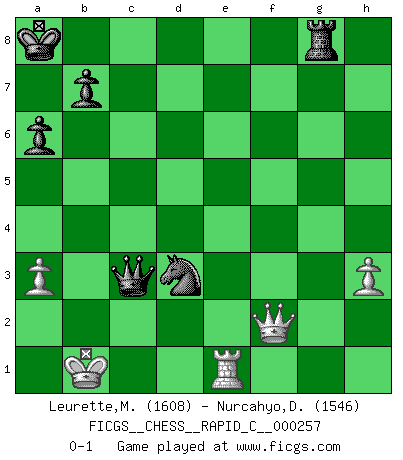 Last move : 0-1 2021 March 22 8:52:9 [Event "FICGS__CHESS__RAPID_C__000257"] [Site "FICGS"] [Date "2021.02.16"] [Round "1"] [White "Leurette,Marc-Antoine"] [Black "Nurcahyo,Dery"] [Result "0-1"] [WhiteElo "1608"] [BlackElo "1546"] 1.e4 Nc6 2.Nf3 e5 3.Bc4 h6 4.Nc3 Nf6 5.d3 a6 6.Be3 d6 7.Qe2 Bg4 8.h3 Be6 9.Bxe6 fxe6 10.O-O-O Qd7 11.a3 Be7 12.d4 exd4 13.Nxd4 Ne5 14.f4 Ng6 15.g4 O-O-O 16.f5 exf5 17.gxf5 Ne5 18.Bf4 Nc6 19.Ne6 Rdg8 20.e5 Ne8 21.Nd5 Kb8 22.Ndxc7 Nxc7 23.exd6 Nxe6 24.dxe7 Nxf4 25.Qe4 Qc7 26.f6 gxf6 27.Rhe1 Re8 28.Qf5 Rhg8 29.Qxf6 Rxe7 30.Qxh6 Ne2+ 31.Kb1 Ncd4 32.c3 Nxc3+ 33.bxc3 Rxe1 34.Rxe1 Qxc3 35.Qf4+ Ka8 36.Qf2 Nb3 37.Ka2 Nc1+ 38.Kb1 Nd3 0-1 KP : Nimzovich defense Queenside Castling by player White (move 10) Queenside Castling by player Black (move 15) Player Black won this chess game. Follow this game move after move (download)Help your pieces so they can help you. (Paul Morphy) Viele Opfer benötigen überhaupt keine konkrete Berechnung. Es genügt sich die entstehende Position kurz vorzustellen, um uns davon zu überzeugen, dass das Opfer korrekt ist. (Mikhail Nekhemyevich Tal) Los finales de Peón son del Ajedrez lo que el cesped es del Golf. (Cecil Purdy) Les écrivains ont utilisé les échecs pour analyser les côtés extrêmes de la nature humaine. Dans ce cadre, les échecs offrent un champ d'expérimentation idéal. Mais on pourrait faire la même chose avec la peinture. Et là, en vous référant à Van Gogh, vous ne tirerez pas de conclusion définitive sur les peintres. (Gary Kasparov) Chess is as much a mystery as women. (Purdy)