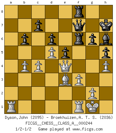 Last move : 1/2-1/2 2021 July 18 15:45:21 [Event "FICGS__CHESS__CLASS_A__000244"] [Site "FICGS"] [Date "2021.02.20"] [Round "1"] [White "Dyson,John"] [Black "Broekhuizen,A. T. S."] [Result "1/2-1/2"] [WhiteElo "2095"] [BlackElo "2036"] 1.Nf3 Nf6 2.c4 g6 3.Nc3 Bg7 4.e4 O-O 5.d4 d6 6.h3 e5 7.d5 a5 8.Bg5 Nbd7 9.Nd2 Nc5 10.Be2 Bd7 11.b3 h6 12.Be3 Nh7 13.h4 h5 14.f3 f5 15.a3 fxe4 16.Ncxe4 b6 17.Qc2 Qe8 18.Rd1 Nf6 19.Bd3 Nxd3+ 20.Qxd3 Bf5 21.Nxf6+ Rxf6 22.Ne4 Bxe4 23.Qxe4 Qf7 24.O-O Rf8 25.b4 axb4 26.axb4 Kh7 27.Ra1 Bh6 1/2-1/2 Reti Opening Kingside Castling by player Black (move 4) Kingside Castling by player White (move 24) This chess game ended in a draw. Follow this game move after move (download)My God, Bobby Fischer plays so simply. (Alexei Suetin) Ich glaube, ich kenne inzwischen die Gründe für mein Versagen: schachliche Charakterfehler. Ich war nie ein Wunderkind und in meiner gesamten menschlichen Entwicklung immer zu langsam. (Viktor Kortschnoi) El Ajedrez es de 30 a 40 por ciento psicología. Uno no cuenta con esto cuando se juega contra una computadora. No lo puedo confundir. (Judith Polgar) Seul un grand joueur sait à quel point il joue faiblement. (Xavier Tartacover) I'll be back. (Arnold Schwarzenegger)