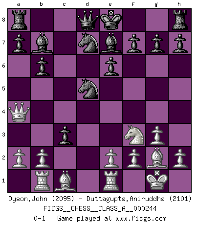 Last move : 0-1 2021 April 24 12:52:31 [Event "FICGS__CHESS__CLASS_A__000244"] [Site "FICGS"] [Date "2021.02.20"] [Round "1"] [White "Dyson,John"] [Black "Duttagupta,Aniruddha"] [Result "0-1"] [WhiteElo "2095"] [BlackElo "2101"] 1.Nf3 Nf6 2.c4 c5 3.Nc3 e6 4.g3 b6 5.Bg2 Bb7 6.O-O Be7 7.Re1 d5 8.cxd5 Nxd5 9.d4 cxd4 10.Qa4+ Nd7 11.Rb1 dxc3 0-1 Reti Opening Kingside Castling by player White (move 6) Player Black won this chess game. Follow this game move after move (download)Is Bobby Fischer quite sane ? (Salo Flohr) Glücklicherweise sind Großmeister Ruben Fines reine Schachbücher weniger phallozentrisch [als seine Schachpsychologie] und deswegen auch weniger lächerlich. (Nigel Short) ¿Que sería del Ajedrez sin errores graciosos?. (Kurt Richter) La victoire dans une partie d'Echecs appartient la plupart du temps à celui qui voit un peu plus loin que l'adversaire. (Lasker) Patience, use the Force, think ! (Obi-Wan Kenobi in Star Wars ep.2)