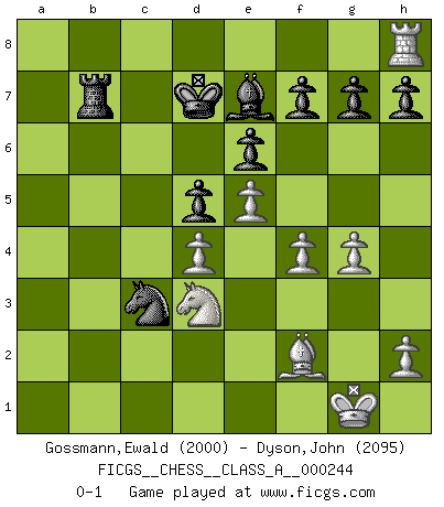Last move : 0-1 2021 July 31 16:47:10 [Event "FICGS__CHESS__CLASS_A__000244"] [Site "FICGS"] [Date "2021.02.20"] [Round "1"] [White "Gossmann,Ewald"] [Black "Dyson,John"] [Result "0-1"] [WhiteElo "2000"] [BlackElo "2095"] 1.e4 c6 2.d4 d5 3.e5 Bf5 4.Be2 e6 5.Nf3 c5 6.c3 Nc6 7.O-O cxd4 8.cxd4 Nge7 9.Nc3 Nc8 10.Ne1 Qb6 11.g4 Bg6 12.Be3 Qxb2 13.Nb5 Rb8 14.f4 Be4 15.Bd3 Bxd3 16.Nc7+ Kd8 17.Nxd3 Qa3 18.Nb5 Qa5 19.a4 a6 20.Qf3 Be7 21.Rfb1 axb5 22.axb5 Qc3 23.Qd1 Na5 24.Rc1 Qb3 25.Rxa5 Qxd1+ 26.Rxd1 Nb6 27.Bf2 Nc4 28.Ra7 Na3 29.Ra1 Nxb5 30.Rxb7 Rxb7 31.Ra8+ Kd7 32.Rxh8 Nc3 0-1 Caro-Kann : Advance variation Kingside Castling by player White (move 7) Player Black won this chess game. Follow this game move after move (download)Chess holds its master in its own bonds, shackling the mind and brain so that the inner freedom of the very strongest must suffer. (Albert Einstein) Ein Isolani verdüstert die Stimmung auf dem ganzen Schachbrett. (Savielly Grigorievitsch Tartakower) Cuando veas una buena jugada, trata de encontrar otra mejor. (Emanuel Lasker) Vous n'êtes pas toujours obligé de jouer le meilleur coup. Un coup doit être actif, entreprenant, correct et beau ! (David Bronstein) When you've done things right people won't know you've done anything at all. (Futurama)
