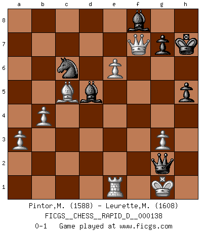Last move : 0-1 2021 March 1 18:52:17 [Event "FICGS__CHESS__RAPID_D__000138"] [Site "FICGS"] [Date "2021.02.20"] [Round "1"] [White "Pintor,Manuel"] [Black "Leurette,Marc-Antoine"] [Result "0-1"] [WhiteElo "1588"] [BlackElo "1608"] 1.e4 e5 2.f4 d6 3.Nf3 Nc6 4.Bc4 Nf6 5.Nc3 exf4 6.d4 Bg4 7.Bxf4 Be7 8.O-O Qd7 9.Qd3 O-O 10.Ng5 h6 11.Nxf7 Rxf7 12.Bxf7+ Kxf7 13.a3 h5 14.Qc4+ Kf8 15.e5 dxe5 16.dxe5 Be6 17.Qb5 Nd5 18.Nxd5 Qxd5 19.Qxb7 Rb8 20.Qxc7 Kg8 21.b4 Rf8 22.Rae1 Qd4+ 23.Be3 Qc4 24.Rxf8+ Bxf8 25.Bxa7 Qxc2 26.h3 Bd5 27.Bf2 Qg6 28.g3 Qf5 29.e6 Qxh3 30.Qf7+ Kh7 31.Bc5 Qg2+ 0-1 King's gambit Kingside Castling by player White (move 8) Kingside Castling by player Black (move 9) Player Black won this chess game. Follow this game move after move (download)Nowadays, when you're not a grandmaster at 14, you can forget about it. (Anand Viswanathan) Es war undenkbar für die Behörden, dass ein sowjetischer Großmeister auf diese Art und Weise [Fischer-Taimanov 6:0] verliert, ohne dass es eine politischer Erklärung dafür gäbe. (Mark Taimanov) Cualquier cambio de material en una posición debe venir por medio de un mate, una captura o promoción de Peón. (Purdy) Lorsque vous vous retrouvez devant une position atroce, ne tendez pas un ultime piège dérisoire avec l'intention d'abandonner si l'adversaire le déjoue ! Faites-vous plutôt un devoir de résister comme si votre vie en dépendait. Jouez le coup qui vous déplairait au centuple si vous étiez dans la peau de votre tortionnaire ! The only sure thing about luck is that it will change. (Wilson Mizner)