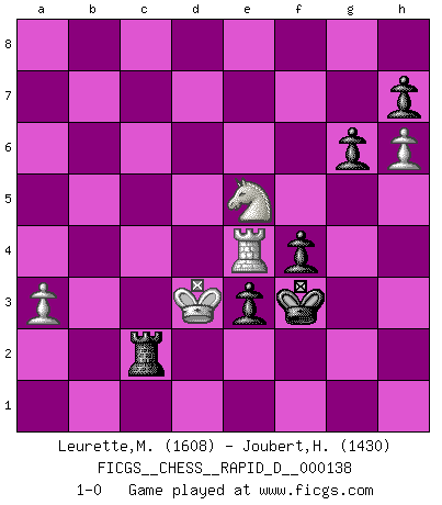 Last move : 1-0 2021 May 12 12:26:39 [Event "FICGS__CHESS__RAPID_D__000138"] [Site "FICGS"] [Date "2021.02.20"] [Round "1"] [White "Leurette,Marc-Antoine"] [Black "Joubert,Hennie"] [Result "1-0"] [WhiteElo "1608"] [BlackElo "1430"] 1.e4 c5 2.d4 cxd4 3.Qxd4 Nc6 4.Qd3 Nf6 5.Nf3 d6 6.Be2 e6 7.Nc3 a6 8.Bg5 Be7 9.Bxf6 Bxf6 10.O-O-O Be7 11.e5 dxe5 12.Qxd8+ Bxd8 13.g4 f6 14.h4 Be7 15.h5 b5 16.h6 g6 17.b3 Bb7 18.Rhg1 Rd8 19.g5 f5 20.Rxd8+ Kxd8 21.Nd2 Ba3+ 22.Kd1 Ke7 23.Ndb1 Bc5 24.Rf1 Rd8+ 25.Kc1 Nd4 26.Bd1 Bf3 27.Nd2 Bxd1 28.Rxd1 Nc6 29.Rf1 Rd4 30.f3 Bb4 31.Ncb1 Rh4 32.a3 Bd6 33.c4 bxc4 34.Nxc4 Rh5 35.Nxd6 Kxd6 36.f4 exf4 37.Rxf4 Rxg5 38.Rh4 e5 39.Nd2 Nd4 40.Nc4+ Ke6 41.Kb2 e4 42.Kc3 Rg3+ 43.Kxd4 Rxb3 44.Rh2 Rd3+ 45.Kc5 Rc3 46.Rb2 Kf6 47.Rb6+ Kg5 48.Rxa6 e3 49.Re6 f4 50.Kd4 Rc2 51.Re5+ Kg4 52.Re4 Kg3 53.Kd3 Kf3 54.Ne5+ 1-0 Sicilian : Smith-Morra gambit Queenside Castling by player White (move 10) Player White won this chess game. Follow this game move after move (download)In order to improve your game, you must study the endgame before everything else, for whereas the endings can be studied and mastered by themselves, the middle game and the opening must be studied in relation to the endgame. (Jose Raul Capablanca) Das Spiel gibt uns die Genugtuung, die das Leben uns versagt. (Emanuel Lasker) De todos mis libros Rusos, la defensa contiene y difunde el 'calor' mas grande que pudiese verse extraño al observar lo supremamente abstracto que el Ajedrez supuestamente es. (Vladimir Nabokov) Psychologiquement, tu dois avoir confiance en toi même, mais cette confiance doit être basée sur des faits. (Robert Fischer) Thus, what is of supreme importance in war is to attack the enemy's strategy. (Sun Tzu)