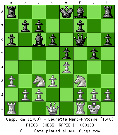 Last move : 0-1 2021 April 4 9:10:7 [Event "FICGS__CHESS__RAPID_D__000138"] [Site "FICGS"] [Date "2021.02.20"] [Round "1"] [White "Capp,Tom"] [Black "Leurette,Marc-Antoine"] [Result "0-1"] [WhiteElo "1700"] [BlackElo "1608"] 1.e4 e5 2.Nf3 Nc6 3.Bb5 Nf6 4.d3 d6 5.Nc3 Bd7 6.Bg5 h6 7.Bxf6 Qxf6 8.a3 a6 9.Bxc6 Bxc6 10.O-O g5 0-1 This chess game has been lost on time (started : 2021.02.20 16:9:18) Ruy Lopez : Berlin defense Kingside Castling by player White (move 10) Player Black won this chess game. Follow this game move after move (download)The battle for the ultimate truth will never be won. And that's why Chess is so fascinating. (Hans Kmoch) Ich verstehe mehr vom Schach als irgendein anderer lebender Meister. (José Raúl Capablanca) En manos de Fischer's, una diminuta ventaja teórica es tan buena como tener una Reina de ventaja. (Isaac Kashdan) Il vaut toujours mieux jouer un plan faux de façon logique que de n'avoir pas de plan du tout. (Victor Kortchnoï) Those parts of the system that you can hit with a hammer (not advised) are called hardware; those program instructions that you can only curse at are called software. (Anonymous)