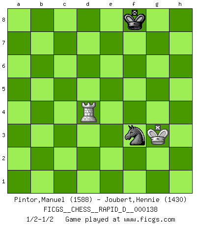 Last move : 1/2-1/2 2021 April 19 14:35:32 [Event "FICGS__CHESS__RAPID_D__000138"] [Site "FICGS"] [Date "2021.02.20"] [Round "1"] [White "Pintor,Manuel"] [Black "Joubert,Hennie"] [Result "1/2-1/2"] [WhiteElo "1588"] [BlackElo "1430"] 1.e4 c5 2.f4 Nc6 3.Nf3 e6 4.Bc4 d6 5.O-O Nf6 6.Nc3 a6 7.a4 Be7 8.d3 O-O 9.Ng5 h6 10.Nh3 Rb8 11.Ne2 b5 12.axb5 axb5 13.Bb3 Bb7 14.c3 b4 15.Ng3 bxc3 16.bxc3 Qc7 17.f5 d5 18.fxe6 fxe6 19.exd5 Nxd5 20.Qg4 Kh8 21.Bxd5 exd5 22.Nf4 Ne5 23.Qh5 d4 24.Ne6 Qc6 25.Qh3 Rf6 26.Nxg7 Rxf1+ 27.Kxf1 Qxg2+ 28.Qxg2 Bxg2+ 29.Kxg2 Kxg7 30.Nf5+ Kf6 31.Nxe7 Kxe7 32.cxd4 cxd4 33.Bxh6 Nxd3 34.Rd1 Rb2+ 35.Kg3 Ne5 36.Rxd4 Rxh2 37.Bf8+ Kxf8 38.Kxh2 Nf3+ 39.Kg3 1/2-1/2 Sicilian : Grand Prix attack Kingside Castling by player White (move 5) Kingside Castling by player Black (move 8) 10 pieces endgame at move 32 : White KRBPP , Black KRNPP WHITE : King + 1 Rook 1 Bishop 2 Pawns BLACK : King + 1 Rook 1 Knight 2 Pawns 9 pieces endgame at move 33 : White KRBPP , Black KRNP WHITE : King + 1 Rook 1 Bishop 2 Pawns BLACK : King + 1 Rook 1 Knight 1 Pawn 8 pieces endgame at move 33 : White KRBP , Black KRNP WHITE : King + 1 Rook 1 Bishop 1 Pawn BLACK : King + 1 Rook 1 Knight 1 Pawn 7 pieces endgame at move 36 : White KRBP , Black KRN WHITE : King + 1 Rook 1 Bishop 1 Pawn BLACK : King + 1 Rook 1 Knight 6 pieces endgame at move 36 : White KRB , Black KRN WHITE : King + 1 Rook 1 Bishop BLACK : King + 1 Rook 1 Knight 5 pieces endgame at move 37 : White KR , Black KRN WHITE : King + 1 Rook BLACK : King + 1 Rook 1 Knight 4 pieces endgame at move 38 : White KR , Black KN WHITE : King + 1 Rook BLACK : King + 1 Knight This chess game ended in a draw. Follow this game move after move (download)Fischer sacrificed virtually everything most of us weakies (to use his term) value, respect, and cherish, for the sake of an artful, often beautiful board game, for the ambivalent privilege of being its greatest master. (Paul Kollar) Das Schachspiel übertrifft alle anderen Spiele so weit wie der Chimborasso einen Misthaufen. (Arthur Schopenhauer) Me dio la sensación de como si yo estuviera jugando en contra del mismo Ajedrez. - al estar jugando en contra de Robert Fischer (Walter Shipman) La vie est comme un jeu d'échecs : nous esquissons un plan, mais celui-ci est tributaire de ce que daignent faire l'adversaire aux échecs et le destin dans la vie. (Arthur Schopenhauer) Being number two sucks. (Andre Agassi)