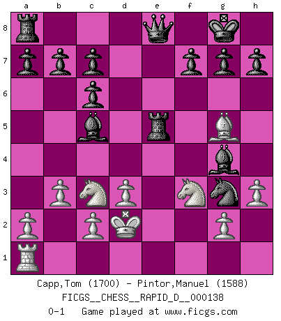 Last move : 0-1 2021 April 11 0:37:4 [Event "FICGS__CHESS__RAPID_D__000138"] [Site "FICGS"] [Date "2021.02.20"] [Round "1"] [White "Capp,Tom"] [Black "Pintor,Manuel"] [Result "0-1"] [WhiteElo "1700"] [BlackElo "1588"] 1.e4 e5 2.Nf3 Nc6 3.Bb5 Bc5 4.Nc3 Nf6 5.b3 O-O 6.Nd5 Nxe4 7.Bxc6 Nxf2 8.Qe2 dxc6 9.Nc3 Nxh1 10.d3 Bg4 11.h3 Ng3 12.Qxe5 Re8 13.Bg5 Rxe5+ 14.Kd2 Qe8 0-1 This chess game has been lost on time (started : 2021.02.20 16:9:18) Ruy Lopez : Classical (Cordel) defense Kingside Castling by player Black (move 5) Player Black won this chess game. Follow this game move after move (download)Those who say they understand Chess, understand nothing. (Robert Hubner) Herr Iljumschinow ist ein etwas merkwürdiger Geschäftsmann: Er arbeitet zusammen mit Leuten wie Muammar al-Gaddafi; früher ist das Saddam Hussein gewesen. (Joel Lautier) Uno no tiene que jugar muy bien, es suficiente jugar mejor que el oponente. (Siegbert Tarrasch) Roi des jeux et jeu des rois, les échecs portent en eux un sentiment d'infini. Ils donnent à celui qui s'est efforcé d'en approfondir les arcanes l'impression de n'être pas à la mesure de l'homme; en fait, ils constituent un résumé de l'univers, un microcosme, et figurent cette grande échelle qui, dans les plans de la lumière descend jusqu'à la matière, qui des abîmes insondables remonte jusqu'en l'infini de Dieu. (Pyrame) A good programmer is someone who always looks both ways before crossing a one-way street. (Doug Linder)