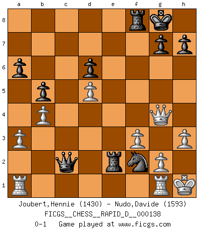 Last move : 0-1 2021 April 13 19:33:1 [Event "FICGS__CHESS__RAPID_D__000138"] [Site "FICGS"] [Date "2021.02.20"] [Round "1"] [White "Joubert,Hennie"] [Black "Nudo,Davide"] [Result "0-1"] [WhiteElo "1430"] [BlackElo "1593"] 1.e4 c5 2.Nf3 d6 3.d4 cxd4 4.Nxd4 Nf6 5.Nc3 a6 6.Bc4 e6 7.Bb3 b5 8.a3 Be7 9.O-O O-O 10.Bg5 Bb7 11.f3 Nbd7 12.Bxe6 fxe6 13.Nxe6 Qb6+ 14.Kh1 Rfe8 15.Nf4 Rac8 16.Qd2 Ne5 17.b3 Qc7 18.Ncd5 Nxd5 19.Nxd5 Bxg5 20.Qxg5 Bxd5 21.exd5 Qxc2 22.b4 Nd3 23.h3 Re2 24.Rg1 Rf8 25.Qg4 Nf2+ 0-1 Sicilian : Najdorf, Lipnitzky attack Kingside Castling by player White (move 9) Kingside Castling by player Black (move 9) Player Black won this chess game. Follow this game move after move (download)First-class players lose to second class players because second-class players sometimes play a first-class game. (Tarrasch) Garry Kasparov war erst in der Großmeister-Organisation GMA, dann in der Profischach-Vereinigung PCA, zum Schluss kehrte er wieder in den Schoß der FIDE zurück. Aber gut, manche Leute sind flexibel (Viswanathan Anand) De todos mis libros Rusos, la defensa contiene y difunde el 'calor' mas grande que pudiese verse extraño al observar lo supremamente abstracto que el Ajedrez supuestamente es. (Vladimir Nabokov) RxDa4 pat (...) Without enthusiasm, virtue functions not at all, and vice only poorly. (Mignon McLaughlin, The Neurotic's Notebook, 1960)