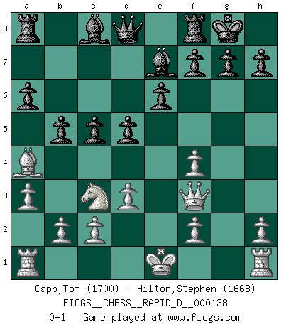 Last move : 0-1 2021 April 16 10:52:24 [Event "FICGS__CHESS__RAPID_D__000138"] [Site "FICGS"] [Date "2021.02.20"] [Round "1"] [White "Capp,Tom"] [Black "Hilton,Stephen"] [Result "0-1"] [WhiteElo "1700"] [BlackElo "1668"] 1.e4 c5 2.Bc4 e6 3.e5 Nc6 4.Nf3 Nge7 5.Nc3 Ng6 6.d3 Be7 7.a3 Ncxe5 8.Nxe5 Nxe5 9.Bf4 Ng6 10.g3 Nxf4 11.gxf4 O-O 12.Qf3 d5 13.Bb5 a6 14.Ba4 b5 0-1 This chess game has been lost on time (started : 2021.02.20 16:9:18) Sicilian defense Kingside Castling by player Black (move 11) Player Black won this chess game. Follow this game move after move (download)Chess demands total concentration. (Bobby Fischer) Ich kenne Menschen, die allen Willen der Welt besitzen und doch nicht Schach spielen können. (Robert James Fischer) ¿Esta Bobby Fischer algo cuerdo?. (Salo Flohr) Karpov est une pièce de musée. (Garry Kasparov) Those who make the worst use of their time are the first to complain of its brevity. (Jean de la Bruyere)