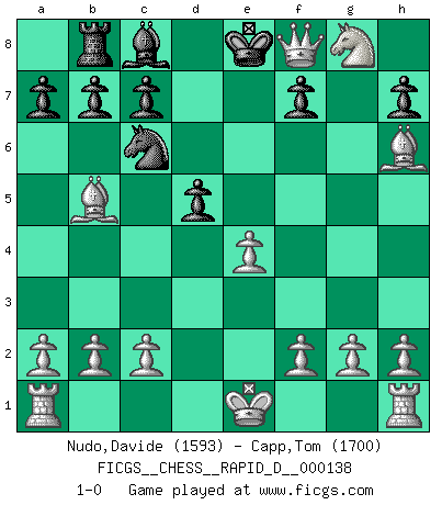 Last move : 1-0 2021 April 11 0:37:4 [Event "FICGS__CHESS__RAPID_D__000138"] [Site "FICGS"] [Date "2021.02.20"] [Round "1"] [White "Nudo,Davide"] [Black "Capp,Tom"] [Result "1-0"] [WhiteElo "1593"] [BlackElo "1700"] 1.e4 e5 2.Nf3 Nc6 3.Bb5 Bc5 4.Nxe5 Nxe5 5.d4 Bxd4 6.Qxd4 Nc6 7.Qxg7 Qf6 8.Qg3 Nh6 9.Nc3 Rg8 10.Nd5 Rb8 11.Nxf6+ Ke7 12.Nxg8+ Kf8 13.Bxh6+ Ke8 14.Qg7 d5 15.Qf8+ 1-0 This chess game has been lost on time (started : 2021.02.20 16:9:18) Ruy Lopez : Classical (Cordel) defense Player White won this chess game. Follow this game move after move (download)A good player is always lucky. (Jose Raul Capablanca) Über Kasparov: Es ist offensichtlich, daß er in einem totalitären Staat aufwuchs und deshalb zu diktatorischen Zügen neigt. (Viktor Kortschnoi) El Ajedrez no es como la vida... ¡tiene reglas!. (Mark Pasternak) La vie et les Echecs sont tous les deux une lutte constante. (Lasker) The Internet is the first thing that humanity has build that humanity doesn't understand, the largest experiment in anarchy that we have ever had. (Eric Schmidt)