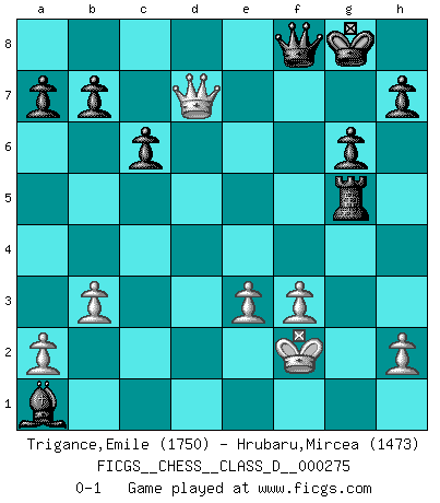 Last move : 0-1 2021 June 12 8:43:38 [Event "FICGS__CHESS__CLASS_D__000275"] [Site "FICGS"] [Date "2021.02.21"] [Round "1"] [White "Trigance,Emile"] [Black "Hrubaru,Mircea"] [Result "0-1"] [WhiteElo "1750"] [BlackElo "1473"] 1.c3 d5 2.d4 Nf6 3.Nf3 c6 4.Bf4 Nh5 5.Be5 Qb6 6.b3 Nd7 7.e3 Nxe5 8.Nxe5 g6 9.Be2 Nf6 10.Nd2 Bg7 11.O-O O-O 12.Qc2 Nd7 13.f4 Nxe5 14.fxe5 Bh6 15.Qd3 Qa6 16.Kf2 Qa3 17.Qc2 f6 18.Kg1 fxe5 19.Rxf8+ Kxf8 20.Nf1 Bf5 21.Qd2 exd4 22.cxd4 Kg8 23.Ng3 Bd7 24.Bf3 e5 25.dxe5 Re8 26.Ne4 Rxe5 27.Qd4 Bg7 28.Qd2 dxe4 29.Qxd7 exf3 30.gxf3 Rg5+ 31.Kf1 Qf8 32.Kf2 Bxa1 0-1 Saragossa Opening Kingside Castling by player White (move 11) Kingside Castling by player Black (move 11) Player Black won this chess game. Follow this game move after move (download)Chess is a matter of delicate judgment, knowing when to punch and how to duck. (Bobby Fischer) Bis zum Jahr 1971 verlief in meiner Schachkariere alles glatt. Dieses dramatische Match [Fischer-Taimanov 6:0] machte mein Leben zur Hölle. (Mark Taimanov) El Ajedrez es el gimnasio de la mente. (Blaise Pascal) Les échecs sont plus proches de l'art de l'assassinat que de l'art de la guerre. (Arturo Perez-Reverte) Whatever you do, don't be bored. This is absolutely the most exciting time we could have possibly hoped to be alive. And things are just starting. (From movie Waking life)