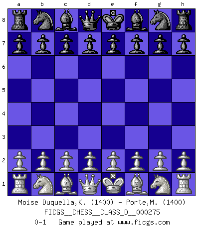 Last move : 0-1 2021 April 2 16:15:13 [Event "FICGS__CHESS__CLASS_D__000275"] [Site "FICGS"] [Date "2021.02.21"] [Round "1"] [White "Moise Duquella,Karly"] [Black "Porte,Marion"] [Result "0-1"] [WhiteElo "1400"] [BlackElo "1400"] 0-1 This chess game has been lost on time (started : 2021.02.21 14:55:31) Player Black won this chess game. Follow this game move after move (download)Combinations have always been the most intriguing aspect of Chess. The masters look for them, the public applauds them, the critics praise them. It is because combinations are possible that Chess is more than a lifeless mathematical exercise. They are the poetry of the game; they are to Chess what melody is to music. They represent the triumph of mind over matter. (Reuben Fine) Strategie ist, wie man ein Mädchen auf den Rücksitz bekommt. Taktik ist, was man tut, wenn man dann dort ist. (Anonymous) El Ajedrez por encima de todo... ¡es una pelea!. (Emanuel Lasker) Je ne suis pas le dernier à jouer lâchement des coups douteux pendant le zeïtnot de l'adversaire pour l'achever: en effet les coups qui font le plus peur sont ceux que l'on ne comprend pas. Je me fais souvent peur quand je joue. (Un professeur anonyme) Life is verb, not a noun. (Charlotte Perkins Gilman)