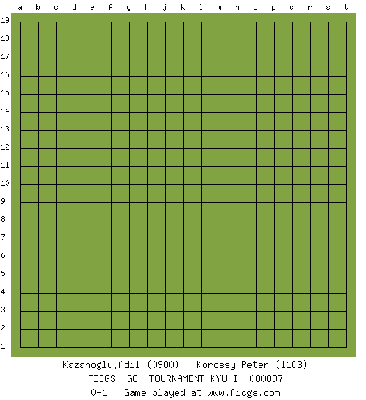 Last move : 0-1 2021 March 24 6:50:59 [Event "FICGS__GO__TOURNAMENT_KYU_I__000097"] [Site "FICGS"] [Date "2021.02.21"] [Round "1"] [Black "Kazanoglu,Adil"] [White "Korossy,Peter"] [Result "0-1"] [Rating 1 "0900"] [Rating 2 "1103"] 0-1 This go game has been lost on time (started : 2021.02.21 18:56:41) Here are the names of the openings (joseki) played in the four corners : Player White won this Go (weiqi, baduk) game. Follow this game move after move (download)If you don't know ladders, don't play go. (Anonymous) The beginning is the most important part of the work. (Plato)