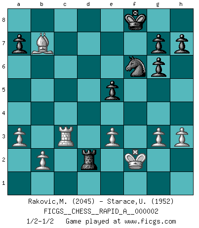 Last move : 1/2-1/2 2006 September 2 19:9:12 [Event "FICGS__CHESS__RAPID_A__000002"] [Site "FICGS"] [Date "2006.06.23"] [Round "1"] [White "Rakovic,Miroslav"] [Black "Starace,Umberto"] [Result "1/2-1/2"] [WhiteElo "2045"] [BlackElo "1952"] 1.c4 Nf6 2.g3 e6 3.Bg2 d5 4.Nf3 Be7 5.O-O O-O 6.Qc2 c5 7.d4 Nc6 8.dxc5 Bxc5 9.a3 dxc4 10.Qxc4 Qd5 11.Qh4 Qf5 12.Nc3 Be7 13.e4 Qg6 14.Qg5 e5 15.Rd1 Bg4 16.Qxg6 fxg6 17.h3 Bxf3 18.Bxf3 Nd4 19.Bg2 Nb3 20.Rb1 Bc5 21.Be3 Bxe3 22.fxe3 Rad8 23.Rxd8 Rxd8 24.Nd5 Nc5 25.Rd1 Kf8 26.Rc1 Ncxe4 27.Nxf6 Nxf6 28.Bxb7 Rd3 29.Rc3 Rd1+ 30.Kf2 Rd2+ 1/2-1/2 English, 1...Nf6 (Anglo-Indian defense) Kingside Castling by player White (move 5) Kingside Castling by player Black (move 5) This chess game ended in a draw. Follow this game move after move (download)When you see a good move, look for a better one. (Emanuel Lasker) Mutter, ich bin eben Ex-Weltmeister geworden. --beim nach Hause Kommen nach dem Verlust des WM-Titels an Mihail Botvinnik -- (Mikhail Nekhemyevich Tal) El jugador táctico debe saber que hacer cuando algo se debe de hacer. El estratégico debe saber que hacer cuando nada se debe de hacer. (Savielly Tartakover) On est toujours la mazette de quelqu'un d'autre. (Anonyme) Now be brave and don't look back. Don't look back. (Shmi Skywalker in Star Wars ep.1)