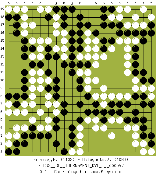 Last move : 0-1 2021 June 30 11:13:19 [Event "FICGS__GO__TOURNAMENT_KYU_I__000097"] [Site "FICGS"] [Date "2021.02.21"] [Round "1"] [Black "Korossy,Peter"] [White "Osipyants,Vladimir"] [Result "0-1"] [Rating 1 "1103"] [Rating 2 "1083"] 1.q16 q4 2.d4 d17 3.c15 g16 4.d12 c6 5.c8 e6 6.f3 b4 7.c3 b3 8.b2 o3 9.r6 q8 10.s4 r3 11.s3 s2 12.t2 r2 13.q7 p8 14.k16 j17 15.k17 r17 16.r16 q17 17.p17 p18 18.o17 o18 19.n17 q11 20.s8 r9 21.r12 q12 22.r13 q13 23.s10 s9 24.r8 t8 25.s7 r10 26.s11 q14 27.r14 m13 28.n14 n13 29.k10 m10 30.k7 k4 31.j3 k3 32.j4 d8 33.c9 d7 34.b7 b6 35.f9 f8 36.g9 c4 37.d3 d5 38.b17 e15 39.d14 e14 40.h17 j18 41.j16 h16 42.h18 g18 43.k18 g17 44.j19 c18 45.b18 c17 46.n6 m4 47.f13 g14 48.g13 h14 49.k14 m14 50.n15 m15 51.m16 l15 52.k15 o14 53.o15 p15 54.p16 q15 55.s16 s17 56.n8 n9 57.g5 g6 58.h6 g7 59.h7 f5 60.g4 o8 61.o7 m8 62.m6 n7 63.p6 h13 64.h12 d9 65.c10 e10 66.f11 f10 67.g10 e9 68.k12 l11 69.k9 k2 70.j2 j1 71.h1 k1 72.g2 a2 73.b1 e13 74.e12 d13 75.c13 d15 76.c14 c16 77.b16 b19 78.n18 q19 79.s18 t18 80.o19 r18 81.j13 l13 82.k5 l5 83.l6 m5 84.g8 c7 85.b8 d11 86.c11 f7 87.t16 o5 88.o6 p5 89.n5 n4 90.r5 e4 91.e3 f4 92.f14 f15 93.l12 m12 94.m7 n8 95.l8 k11 96.j11 k13 97.j12 l16 98.l17 r15 99.s15 l10 100.g19 f19 101.h19 l9 102.t17 s19 103.f18 e19 104.t7 t9 105.r11 h15 106.q5 r4 107.t10 c19 108.a18 s1 109.s5 a7 110.a8 a6 111.n19 p19 112.j14 a3 113.c2 t1 114.t3 e11 115.p7 a19 116.a1 l14 117.j15 d10 118.pass pass 0-1 Here are the names of the openings (joseki) played in the four corners : Corner d16 : d17 c15 Komoku (Somok, Xiao~mu`) 3-4 Point. The komoku (3-4) point is the traditional corner enclosure move.. Ikken Kakari (Hankan Keolch'im, Yi Gua`jiao~, 1-Space Low Pincer). The small knight move is the basic approach move to the 3-4 point stone. It has been continually used for over four centuries. There are limitless variations, with new moves constantly being discovered. Black 2 opens the door to a treaure store of joseki. Corner d4 : d4 c6 Hoshi (Hwajeom, Seongjeom, Xingwei`) 4-4 Point. The star or hoshi (4-4) point, emphasizing influence at the potential expense of territory. Ikken Kakari (Hankan Keolch'im, Yi Gua`jiao~, 1-Space Low Approach). White 2 is the standard approach move to the 4-4. Corner q16 : q16 r17 Hoshi (Hwajeom, Seongjeom, Xingwei`) 4-4 Point. The star or hoshi (4-4) point, emphasizing influence at the potential expense of territory. Player White won this Go (weiqi, baduk) game. Follow this game move after move (download)Territory is a closed space where time no longer exists. The transformation around it slower alter it, and sometimes it cracks open like a rotten egg at the least shock. (Pierre Audouard) Plans are ideas that never come to fruition. (Daniel Parmet)