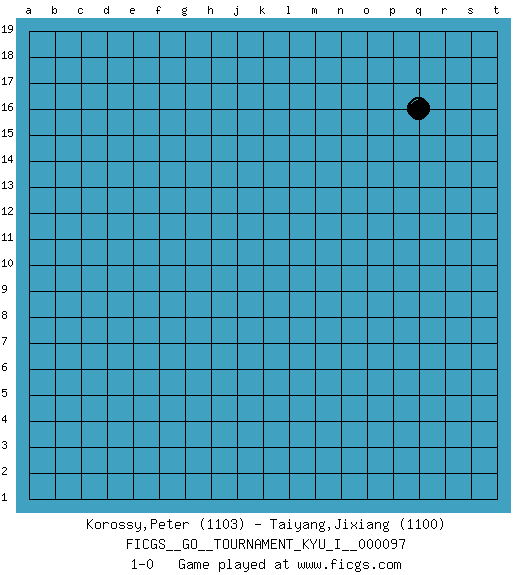 Last move : 1-0 2021 March 24 6:50:59 [Event "FICGS__GO__TOURNAMENT_KYU_I__000097"] [Site "FICGS"] [Date "2021.02.21"] [Round "1"] [Black "Korossy,Peter"] [White "Taiyang,Jixiang"] [Result "1-0"] [Rating 1 "1103"] [Rating 2 "1100"] 1.q16 1-0 This go game has been lost on time (started : 2021.02.21 18:56:41) Here are the names of the openings (joseki) played in the four corners : Player Black won this Go (weiqi, baduk) game. Follow this game move after move (download)Keshi is worth as much as an invasion ! (Anonymous) Statistics can be made to prove anything - even the truth. (Author unknown)