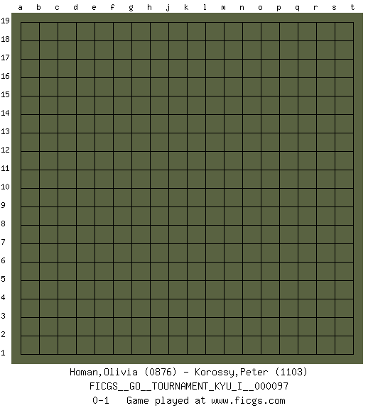 Last move : 0-1 2021 March 24 6:50:59 [Event "FICGS__GO__TOURNAMENT_KYU_I__000097"] [Site "FICGS"] [Date "2021.02.21"] [Round "1"] [Black "Homan,Olivia"] [White "Korossy,Peter"] [Result "0-1"] [Rating 1 "0876"] [Rating 2 "1103"] 0-1 This go game has been lost on time (started : 2021.02.21 18:56:41) Here are the names of the openings (joseki) played in the four corners : Player White won this Go (weiqi, baduk) game. Follow this game move after move (download)Balance is not what players strike for, and if it does arise, it is in spite of them. (Pierre Audouard) Life is like a game of cards: the hand you are dealt represents determinism; the way you play it is free will. (Jawaharlal Nehru)