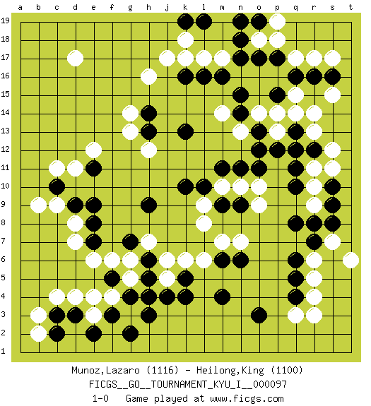 Last move : 1-0 2021 September 8 12:52:2 [Event "FICGS__GO__TOURNAMENT_KYU_I__000097"] [Site "FICGS"] [Date "2021.02.21"] [Round "1"] [Black "Munoz,Lazaro"] [White "Heilong,King"] [Result "1-0"] [Rating 1 "1116"] [Rating 2 "1100"] 1.q16 d4 2.q4 d17 3.q10 d11 4.k16 h16 5.k4 k17 6.l16 l17 7.m16 m17 8.n17 j17 9.k10 r3 10.f3 f4 11.g4 r4 12.q5 q3 13.o3 r5 14.q6 r6 15.q8 g3 16.h3 e3 17.g2 g5 18.e2 j5 19.k5 k6 20.m4 l6 21.f5 e4 22.h5 g6 23.j4 j6 24.r7 s7 25.s8 t6 26.c3 c4 27.d3 b3 28.c2 b2 29.m6 m7 30.n6 n7 31.n9 l8 32.h9 r17 33.r16 q17 34.p17 s17 35.s16 p18 36.o17 o18 37.n18 n13 38.k13 m10 39.m11 n10 40.n11 o9 41.m9 l9 42.l10 o10 43.o11 p14 44.p15 q14 45.o13 o14 46.n14 p13 47.o12 m14 48.n15 q15 49.e9 d8 50.d9 c9 51.e8 d7 52.e7 e6 53.g7 f6 54.h6 h7 55.h4 h12 56.h14 g14 57.h13 g13 58.e11 e12 59.c10 b9 60.p12 r13 61.r12 s12 62.q12 s11 63.q13 r14 64.s10 r9 65.r8 r10 66.s9 r11 67.q11 s15 68.o19 p19 69.n19 c11 70.l19 k18 71.k19 1-0 This go game has been lost on time (started : 2021.02.21 18:56:41) Here are the names of the openings (joseki) played in the four corners : Corner q4 : q4 r3 Hoshi (Hwajeom, Seongjeom, Xingwei`) 4-4 Point. The star or hoshi (4-4) point, emphasizing influence at the potential expense of territory. Corner d4 : d4 f3 Hoshi (Hwajeom, Seongjeom, Xingwei`) 4-4 Point. The star or hoshi (4-4) point, emphasizing influence at the potential expense of territory. Ikken Kakari (Hankan Keolch'im, Yi Gua`jiao~, 1-Space Low Approach). Black 2 is the standard approach move to the 4-4. Player Black won this Go (weiqi, baduk) game. Follow this game move after move (download)Strike at the waist of the knight's move. (Anonymous) A journey of a thousand sites begins with a single click. (Author unknown)