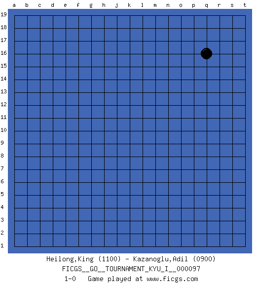 Last move : 1-0 2021 March 29 8:6:45 [Event "FICGS__GO__TOURNAMENT_KYU_I__000097"] [Site "FICGS"] [Date "2021.02.21"] [Round "1"] [Black "Heilong,King"] [White "Kazanoglu,Adil"] [Result "1-0"] [Rating 1 "1100"] [Rating 2 "0900"] 1.q16 1-0 This go game has been lost on time (started : 2021.02.21 18:56:41) Here are the names of the openings (joseki) played in the four corners : Player Black won this Go (weiqi, baduk) game. Follow this game move after move (download)Balance is not what players strike for, and if it does arise, it is in spite of them. (Pierre Audouard) There is a computer disease that anybody who works with computers knows about. It's a very serious disease and it interferes completely with the work. The trouble with computers is that you 'play' with them ! (Richard P. Feynman)