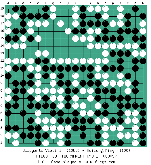 Last move : 1-0 2021 April 26 10:40:13 [Event "FICGS__GO__TOURNAMENT_KYU_I__000097"] [Site "FICGS"] [Date "2021.02.21"] [Round "1"] [Black "Osipyants,Vladimir"] [White "Heilong,King"] [Result "1-0"] [Rating 1 "1083"] [Rating 2 "1100"] 1.q16 d16 2.d4 q3 3.q5 r5 4.r6 r4 5.q7 q9 6.s6 c3 7.d3 c4 8.c5 b5 9.b6 a4 10.d6 r14 11.q12 p14 12.o16 o12 13.p11 j16 14.l17 l15 15.d10 d12 16.c17 d17 17.c16 c15 18.b15 b14 19.d15 c14 20.d18 e15 21.e18 e17 22.f18 f17 23.a6 o4 24.k4 m3 25.l3 g4 26.j7 o7 27.p8 p9 28.o8 o9 29.n8 n11 30.s9 r11 31.s11 r12 32.r16 r8 33.s8 d8 34.f7 e10 35.d9 e9 36.c8 e7 37.d7 e8 38.e6 g8 39.j9 g7 40.g6 f8 41.f6 l5 42.k5 k6 43.j6 k7 44.m4 m2 45.l2 m5 46.l4 c10 47.c11 d11 48.c9 b10 49.b11 c12 50.b9 b12 51.a10 n16 52.n17 m16 53.m17 k17 54.k8 m7 55.n5 l6 56.n7 n6 57.o5 n4 58.o6 m8 59.m9 l8 60.l9 h6 61.h5 h7 62.n3 o3 63.n2 o2 64.m1 k18 65.l18 g18 66.k11 j12 67.h11 h12 68.j11 k12 69.l11 l12 70.g11 g12 71.r10 q10 72.q13 q14 73.r13 s13 74.s12 s14 75.q11 n10 76.n9 o10 77.o15 o14 78.n15 m14 79.s16 p17 80.o17 q18 81.r18 q17 82.r17 o18 83.n18 m19 84.l19 k19 85.q15 n14 86.l16 m15 87.k16 k15 88.b16 g19 89.t3 s3 90.t4 s5 91.t5 s2 92.t2 s1 93.p4 p3 94.q4 s4 95.f19 h17 96.f11 e11 97.f12 f13 98.m11 m12 99.e12 e13 100.h9 g10 101.h10 h8 102.j8 k10 103.m10 k9 104.r7 p6 105.p7 p5 106.q6 t16 107.t15 t17 108.t18 n19 109.s15 o19 110.s19 q19 111.p15 b18 112.c18 a18 113.c19 a16 114.a15 a17 115.b19 a14 116.p1 o1 117.q1 q2 118.c2 b2 119.d2 b1 120.a5 b4 121.a3 a2 122.b3 g9 123.o11 n12 124.p13 o13 125.t14 t13 126.t12 r9 127.f10 a12 128.t6 g3 129.t1 r2 130.n1 j3 131.j4 e4 132.f2 g2 133.j2 h2 134.k3 h3 135.e3 f4 136.j1 h1 137.g5 f1 138.e1 e5 139.h4 f3 140.e2 a8 141.b8 a7 142.b7 a11 143.pass pass 144.pass pass 145.pass 1-0 Here are the names of the openings (joseki) played in the four corners : Corner q4 : q3 q5 Komoku (Somok, Xiao~mu`) 3-4 Point. The komoku (3-4) point is the traditional corner enclosure move.. Ikken Takagakari (Hankan Nop'dakeolch'im, Yi Gaogua`jiao~, 1-Space High Approach). The 5-4 approach move has become more popular in modern times, as modern Go emphasizes speed and influence. Corner d4 : d4 c3 Hoshi (Hwajeom, Seongjeom, Xingwei`) 4-4 Point. The star or hoshi (4-4) point, emphasizing influence at the potential expense of territory. Corner q16 : q16 r14 Hoshi (Hwajeom, Seongjeom, Xingwei`) 4-4 Point. The star or hoshi (4-4) point, emphasizing influence at the potential expense of territory. Ikken Kakari (Hankan Keolch'im, Yi Gua`jiao~, 1-Space Low Approach). White 2 is the standard approach move to the 4-4. Player Black won this Go (weiqi, baduk) game. Follow this game move after move (download)In an unreasonable situation, an unreasonable move is reasonable. (Tamino) My poor ole parrot... Is not in the circulation of displays ....poo hoo hoo :) (Wayne Lowrance's enigma)