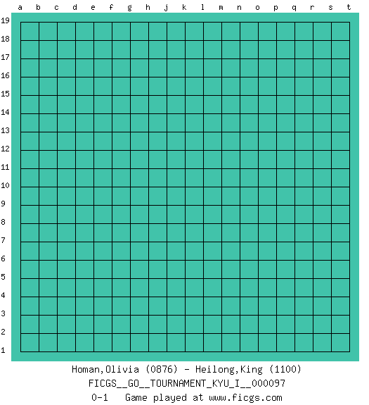 Last move : 0-1 2021 March 24 6:50:59 [Event "FICGS__GO__TOURNAMENT_KYU_I__000097"] [Site "FICGS"] [Date "2021.02.21"] [Round "1"] [Black "Homan,Olivia"] [White "Heilong,King"] [Result "0-1"] [Rating 1 "0876"] [Rating 2 "1100"] 0-1 This go game has been lost on time (started : 2021.02.21 18:56:41) Here are the names of the openings (joseki) played in the four corners : Player White won this Go (weiqi, baduk) game. Follow this game move after move (download)More haste less speed. (John Fairbairn) No, no, you're not thinking; you're just being logical. (Niels Bohr)