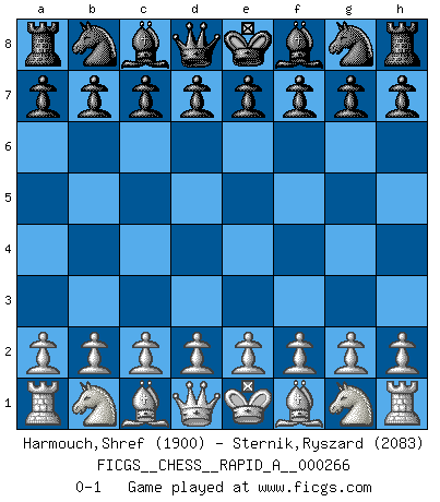 Last move : 0-1 2021 March 25 9:31:36 [Event "FICGS__CHESS__RAPID_A__000266"] [Site "FICGS"] [Date "2021.02.22"] [Round "1"] [White "Harmouch,Shref"] [Black "Sternik,Ryszard"] [Result "0-1"] [WhiteElo "1900"] [BlackElo "2083"] 0-1 This chess game has been lost on time (started : 2021.02.22 20:38:38) Player Black won this chess game. Follow this game move after move (download)Chess makes man wiser and clear-sighted. (Vladimir Putin) Auf jeden Fall musst du zuerst Rechtsanwalt werden, damit du deine eigenen Interessen und die deiner Familie vertreten kannst. [Brief an seinen Sohn] (José Raúl Capablanca) El Ajedrez lo es todo: arte, ciencia y deporte. (Anatoly Karpov) Même si l'adversaire joue le coup analysé précédemment, recommencez l'analyse en voyant la nouvelle position. Première règle de Blumenfeld Programmer - an organism that turns coffee into software. (Anonymous)