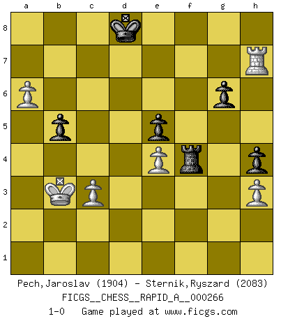 Last move : 1-0 2021 July 15 18:28:50 [Event "FICGS__CHESS__RAPID_A__000266"] [Site "FICGS"] [Date "2021.02.22"] [Round "1"] [White "Pech,Jaroslav"] [Black "Sternik,Ryszard"] [Result "1-0"] [WhiteElo "1904"] [BlackElo "2083"] 1.e4 d5 2.exd5 Qxd5 3.Nc3 Qa5 4.d4 Nf6 5.Nf3 c6 6.Bc4 Bf5 7.Bd2 e6 8.Nd5 Qd8 9.Nxf6+ Qxf6 10.Qe2 Nd7 11.O-O-O Bg4 12.d5 Bxf3 13.gxf3 cxd5 14.Bxd5 O-O-O 15.Be4 Nc5 16.Be3 a6 17.Kb1 Nxe4 18.fxe4 Bd6 19.Qc4+ Kb8 20.Rd3 Rc8 21.Qb3 Bf4 22.Bd4 e5 23.Bb6 Qc6 24.Rhd1 h5 25.a4 Qc4 26.Qxc4 Rxc4 27.Rd7 Rf8 28.h3 Bg5 29.f3 Kc8 30.a5 Bf6 31.R1d5 Rc6 32.c3 h4 33.Kc2 Bg5 34.b4 g6 35.Kb3 f5 36.Rh7 fxe4 37.fxe4 Bf6 38.R5d7 Bd8 39.Rxd8+ Rxd8 40.Bxd8 Kxd8 41.Rxb7 Rf6 42.Rh7 Rf4 43.b5 axb5 44.a6 1-0 Scandinavian (centre counter) defense Queenside Castling by player White (move 11) Queenside Castling by player Black (move 14) Player White won this chess game. Follow this game move after move (download)I am the best player in the world and I am here to prove it. (Bobby Fischer) Ich habe Kasparov in Rente geschickt. (Veselin Topalov) El Jaque al descubierto es el bombardero del tablero. (Reuben Fine) Une platitude souvent récitée à propos des Echecs est qu'une des choses les plus difficiles à réaliser est de gagner une position gagnante. Cela ne manque pas de sens mais, pour ma part, j'ai toujours trouvé plus difficile de gagner une position perdante. (Tim Krabbe) Wipe them out. All of them. (Darth Sidious in Star Wars ep.1)