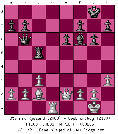 Last move : 1/2-1/2 2021 April 19 18:6:51 [Event "FICGS__CHESS__RAPID_A__000266"] [Site "FICGS"] [Date "2021.02.22"] [Round "1"] [White "Sternik,Ryszard"] [Black "Cesbron,Guy"] [Result "1/2-1/2"] [WhiteElo "2083"] [BlackElo "2180"] 1.e4 c5 2.Nf3 d6 3.d4 cxd4 4.Qxd4 Nc6 5.Qe3 Nf6 6.Nc3 g6 7.h3 Bg7 8.Bc4 O-O 9.O-O Nd7 10.Qe2 Nc5 11.Be3 Bd7 12.Bxc5 dxc5 13.e5 Nd4 14.Nxd4 cxd4 15.Rad1 Bc6 16.Nb5 Bxb5 17.Bxb5 Qb6 18.Bc4 Rac8 19.Bb3 Rc5 20.Rxd4 Rxe5 21.Qd2 Rc5 22.Rd3 e6 23.c3 Bf6 24.Rd1 Bg5 25.Qe2 Rd8 26.Rxd8+ Bxd8 27.Bc2 Bf6 1/2-1/2 Sicilian, Chekhover variation Kingside Castling by player Black (move 8) Kingside Castling by player White (move 9) This chess game ended in a draw. Follow this game move after move (download)Mistrust is the most necessary characteristic of the Chess player. (Siegbert Tarrasch) Schach ist gnadenlos. Du mußt bereit sein zu töten. (Nigel Short) No hay precio que no valga la pena por la cabellera del Rey enemigo. (Koblentz) Les pièces de l'échiquier étaient impitoyables. Elles le retenaient, elles l'absorbaient. Il y avait de l'horreur en cela, mais aussi une harmonie unique. Car, qu'y a-t-il dans le monde, à part les échecs ? (V. Nabokov) You have to believe in yourself. (Sun Tzu)