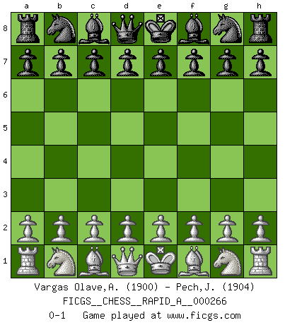 Last move : 0-1 2021 March 25 9:31:36 [Event "FICGS__CHESS__RAPID_A__000266"] [Site "FICGS"] [Date "2021.02.22"] [Round "1"] [White "Vargas Olave,Alejandro"] [Black "Pech,Jaroslav"] [Result "0-1"] [WhiteElo "1900"] [BlackElo "1904"] 0-1 This chess game has been lost on time (started : 2021.02.22 20:38:38) Player Black won this chess game. Follow this game move after move (download)Many have become Chess Masters, no one has become the Master of Chess. (Siegbert Tarrasch) Ein Remis kann durch Wiederholung von drei Zügen oder durch einen schlechte Zug erreicht werden. (Savielly Grigorievitsch Tartakower) Bendita sea la memoria de aquel que dio al mundo este juego inmortal. (A. G. Gardiner) D'abord les bases : Jouez et étudiez, puis étudiez et jouez, ensuite jouez et étudiez, puis étudiez et jouez. Deuxièmement : Donnez toujours le meilleur de vous-même ! (Ken Smith) When you don't know what to do, walk fast and look worried. (Anonymous)